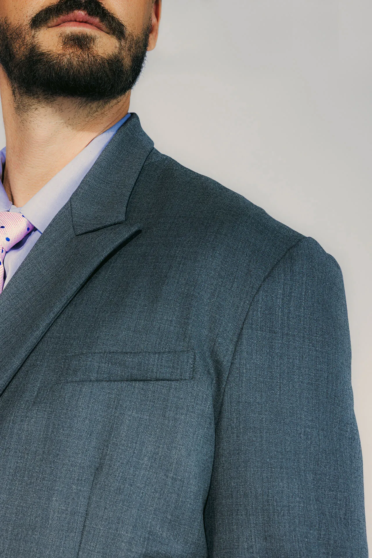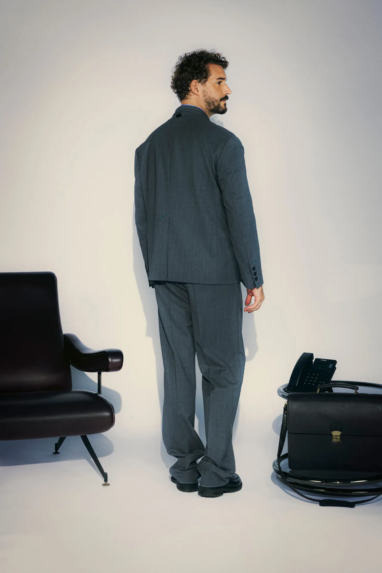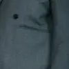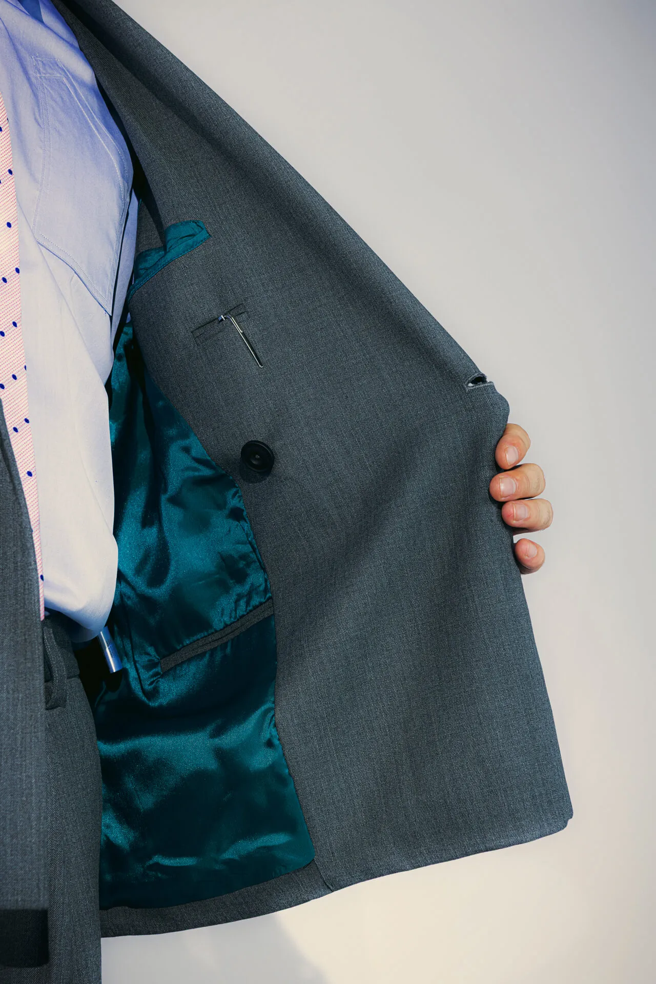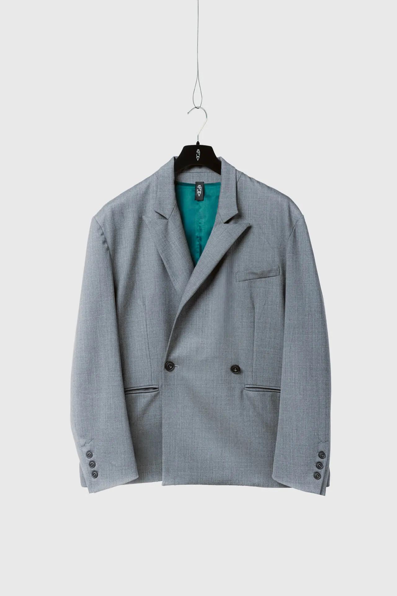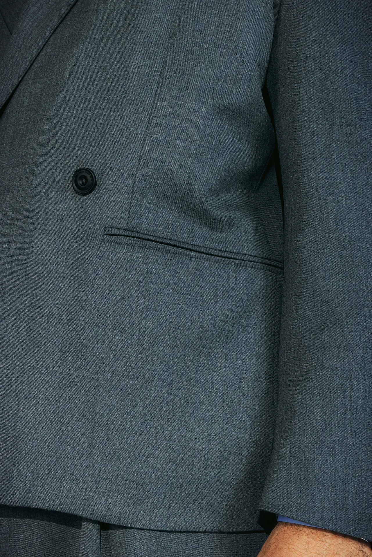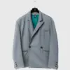 Giacca sartoriale a doppio petto in lana grigio perla con chiusura a due bottoni e fodera interna ottanio. Rever classico, taschino sul petto e due tasche frontali a filetto. Bottoni su fondo manica con impuntura a contrasto.