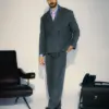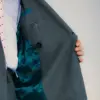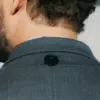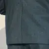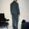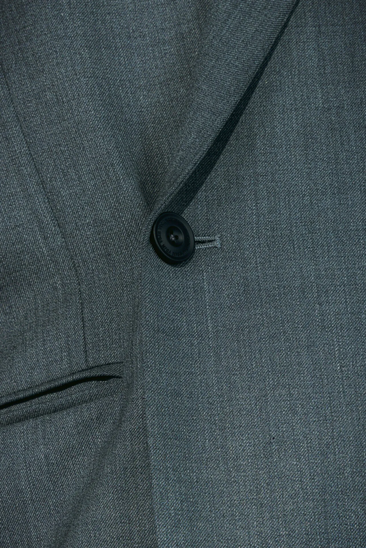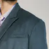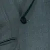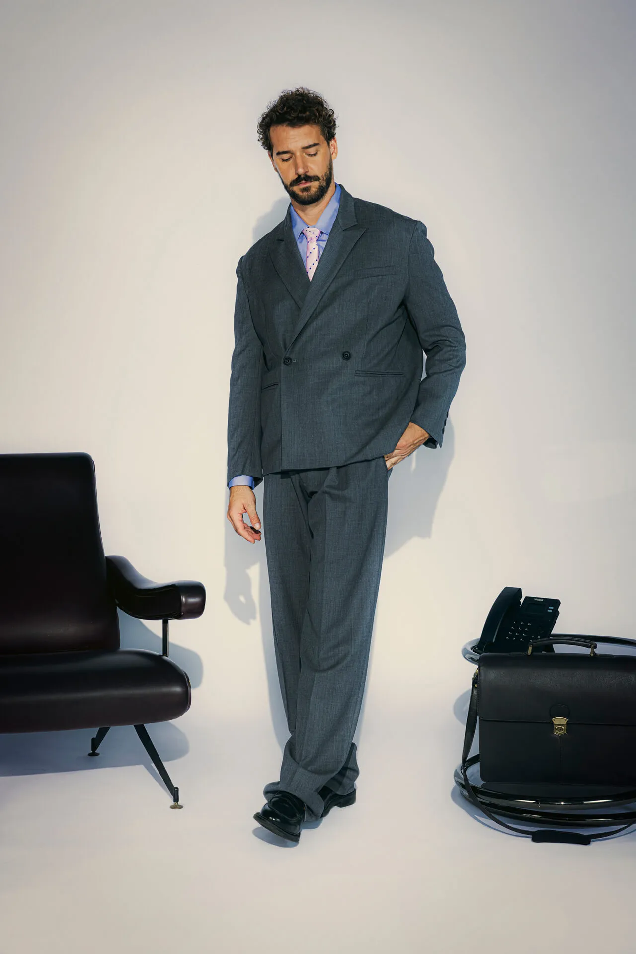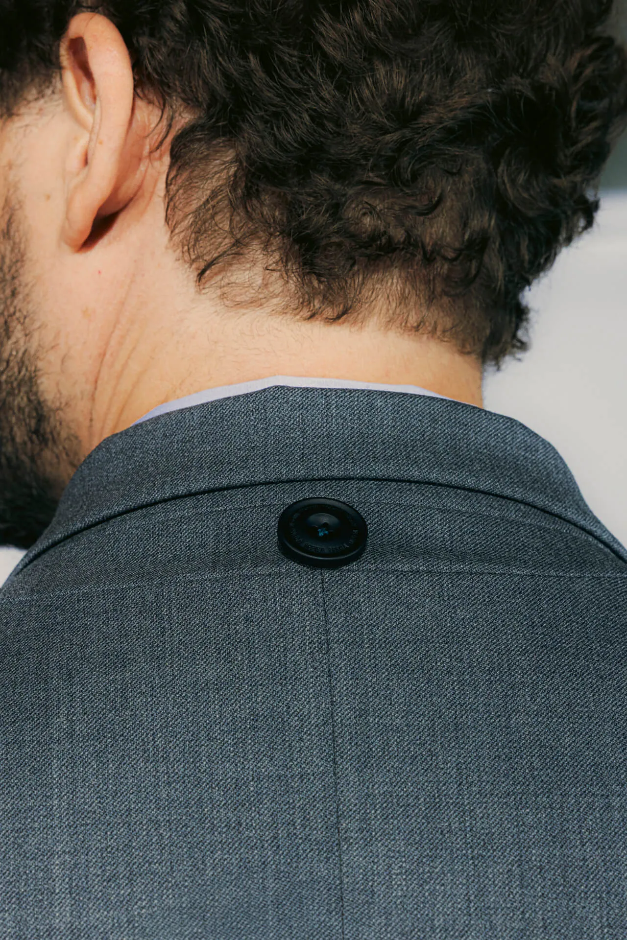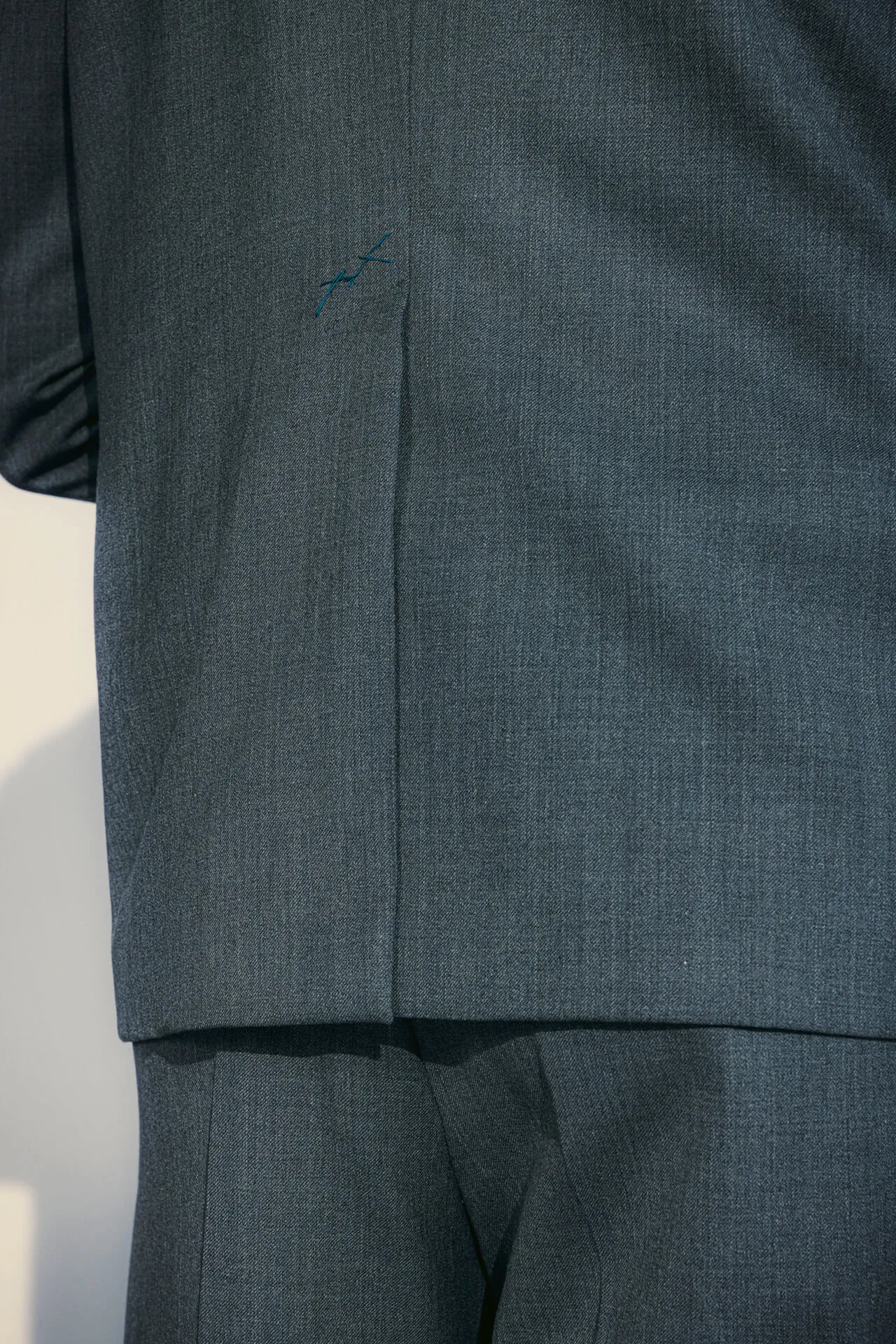 Giacca sartoriale a doppio petto in lana grigio perla con chiusura a due bottoni e fodera interna ottanio. Rever classico, taschino sul petto e due tasche frontali a filetto. Bottoni su fondo manica con impuntura a contrasto.