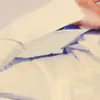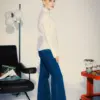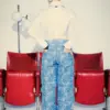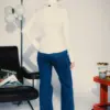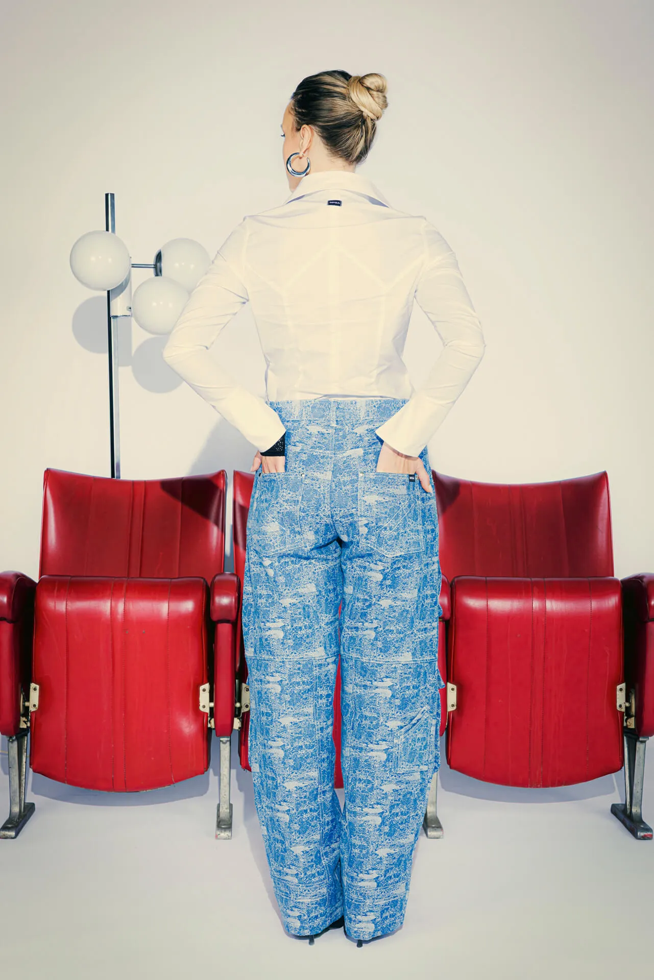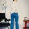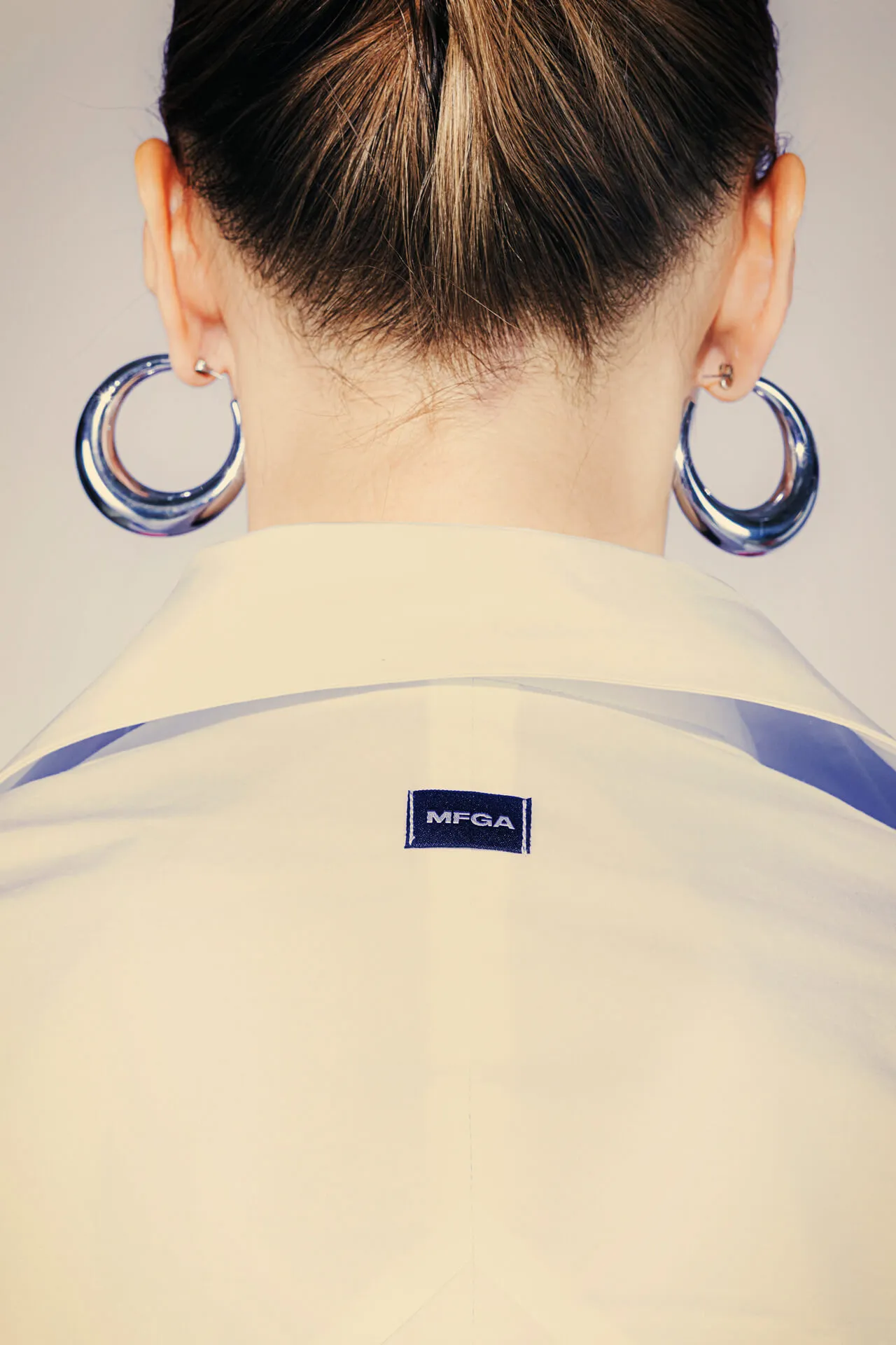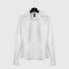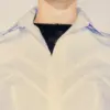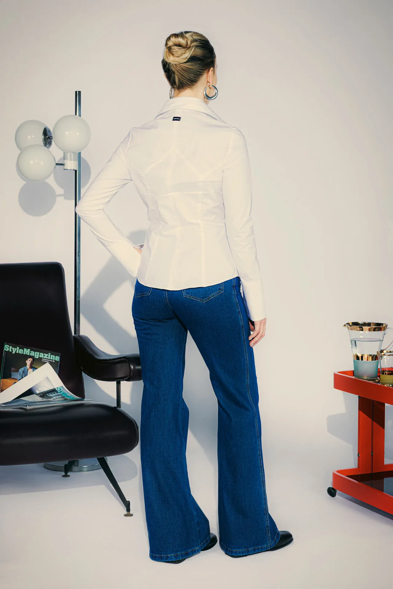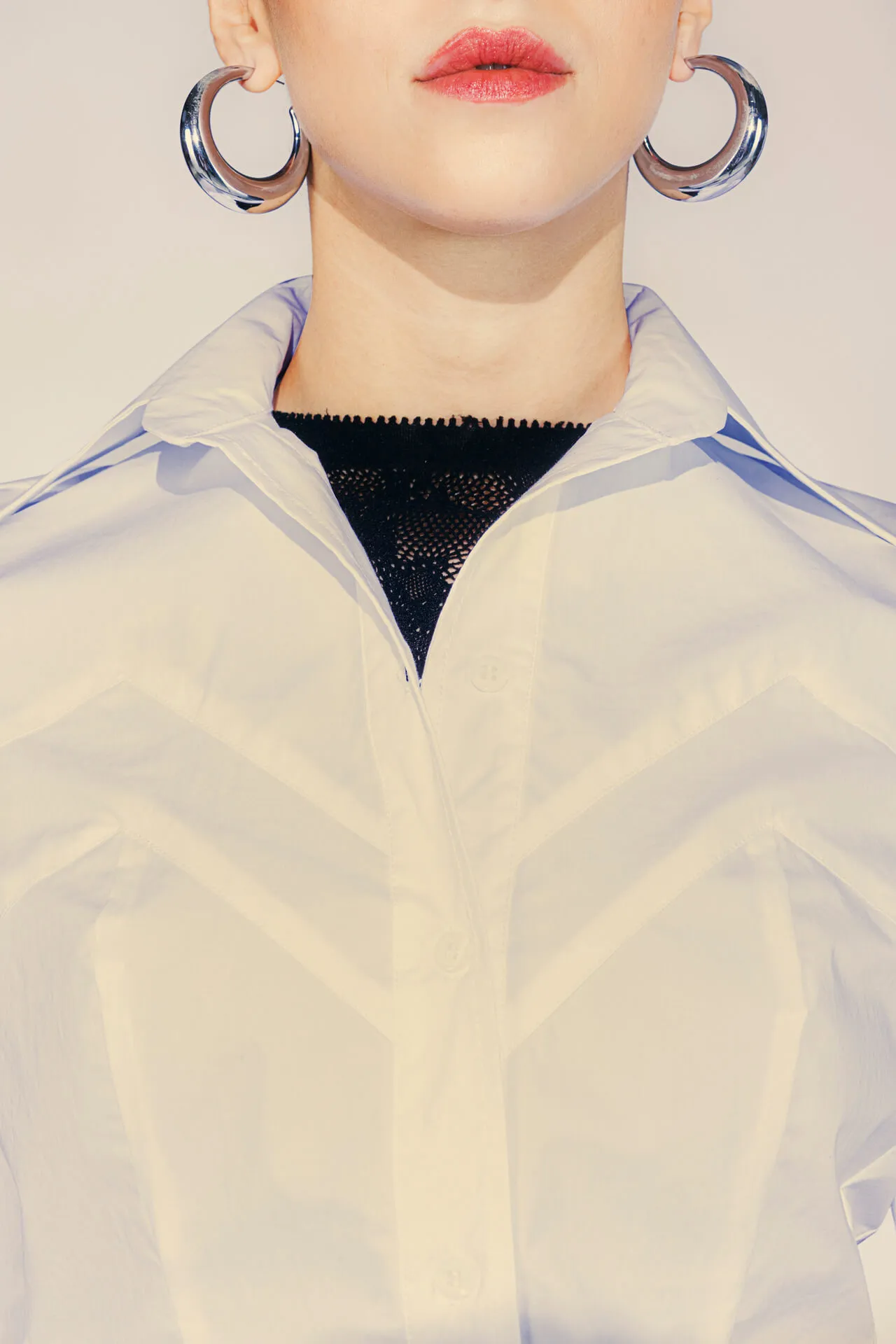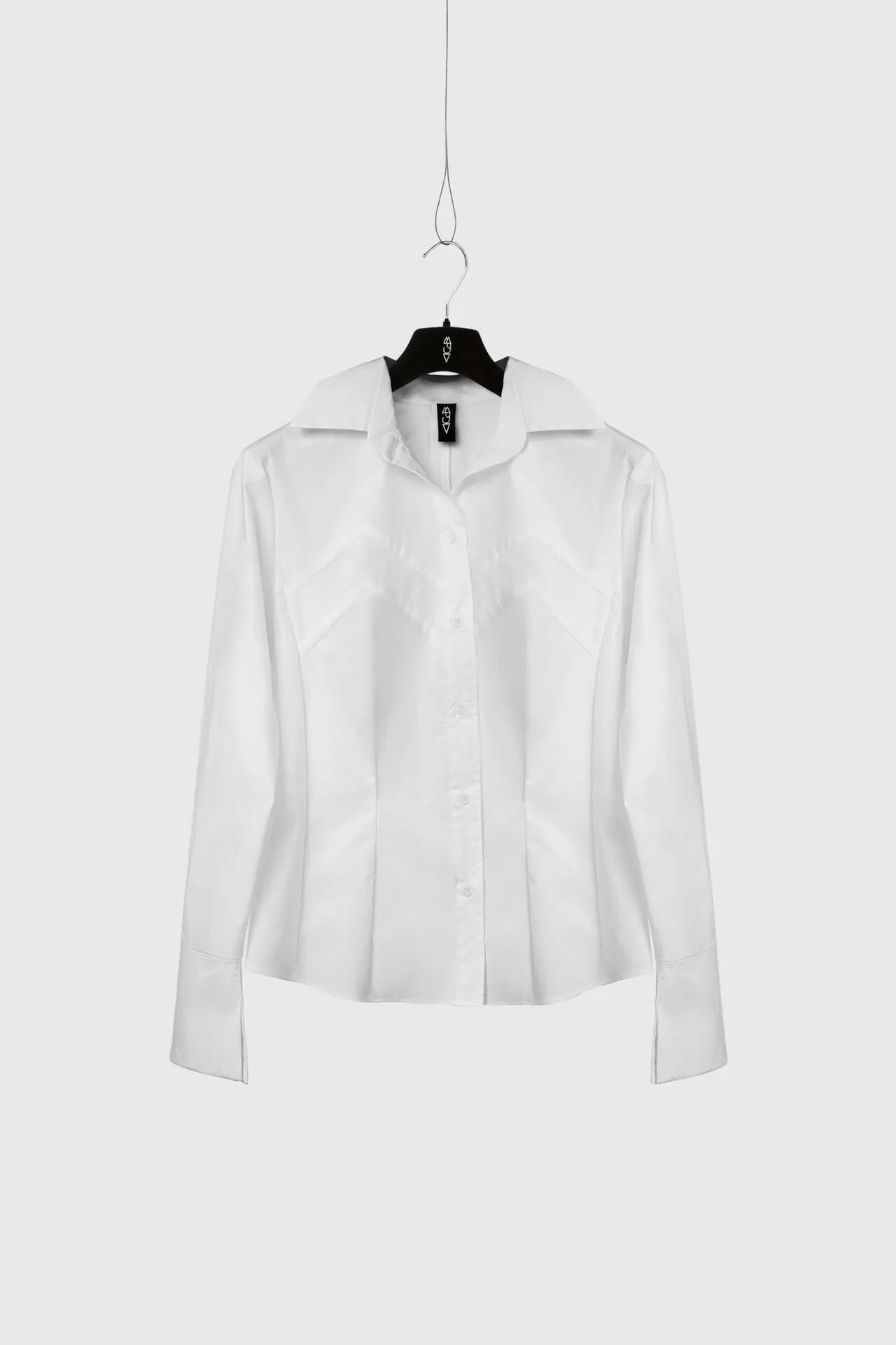 Camicia bianca a maniche lunghe in 100% cotone. Colletto classico, chiusura frontale con bottoni e cuciture geometriche cucite sul petto.