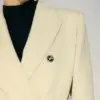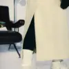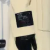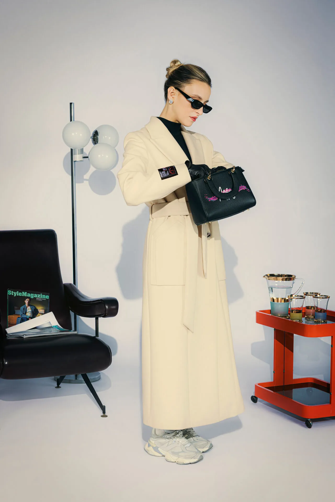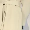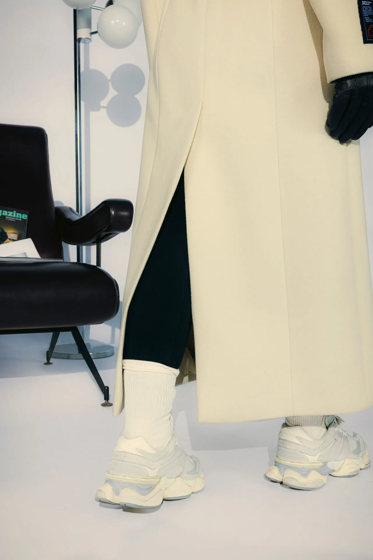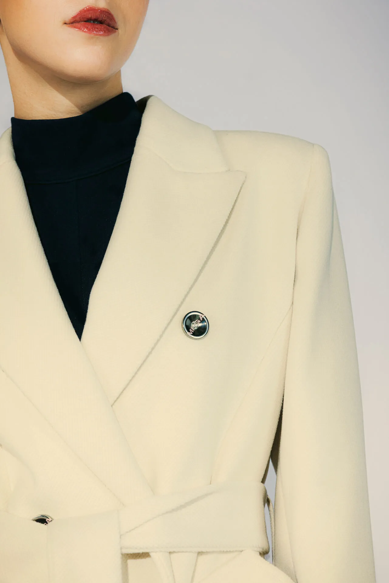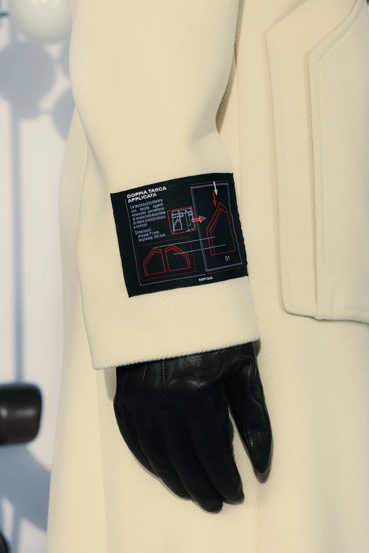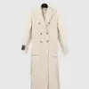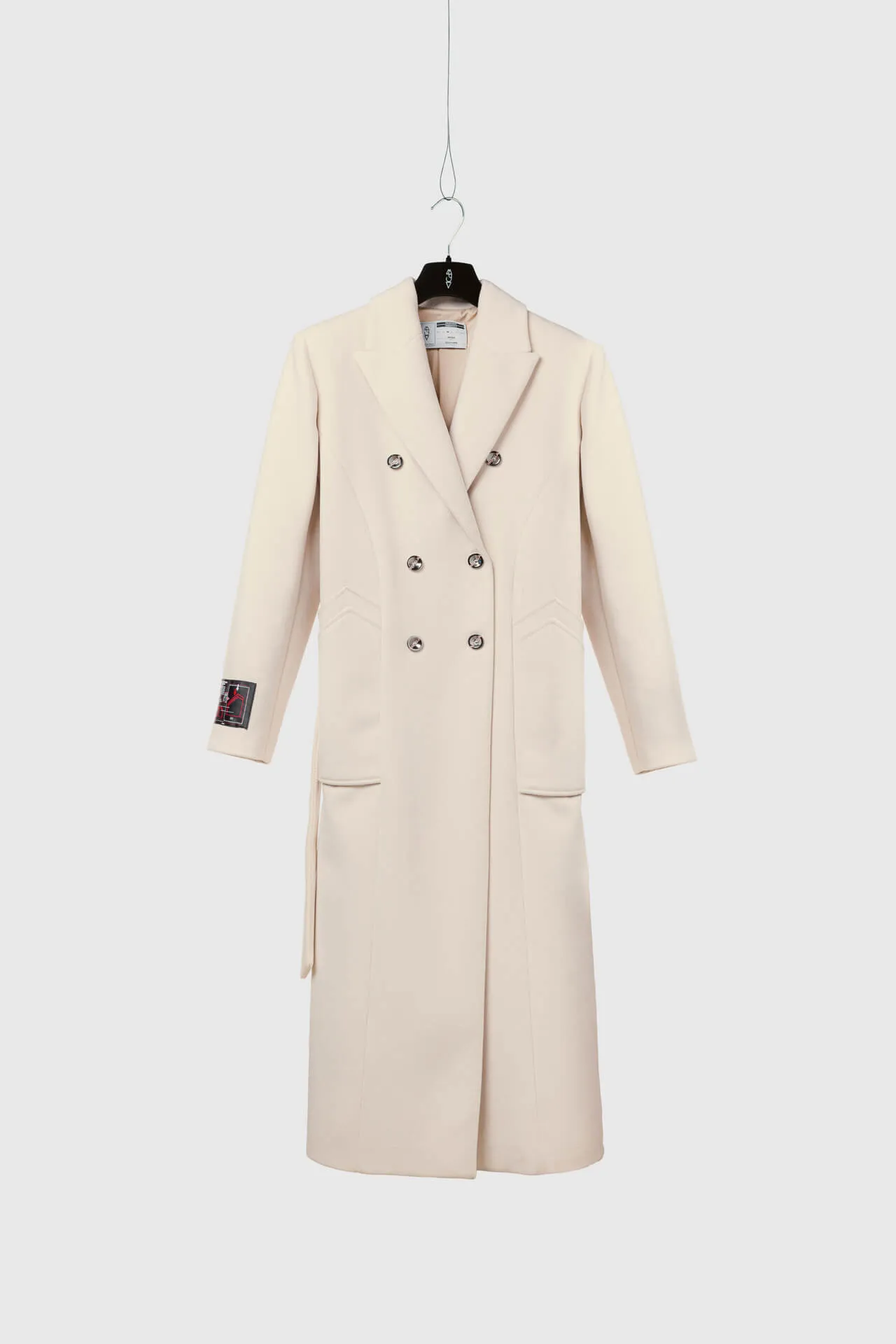 Cappotto lungo doppiopetto con bottoni metallici MFGA. Cintura abbinata, tasche laterali ed etichetta con grafica della doppia tasca sulla manica destra.