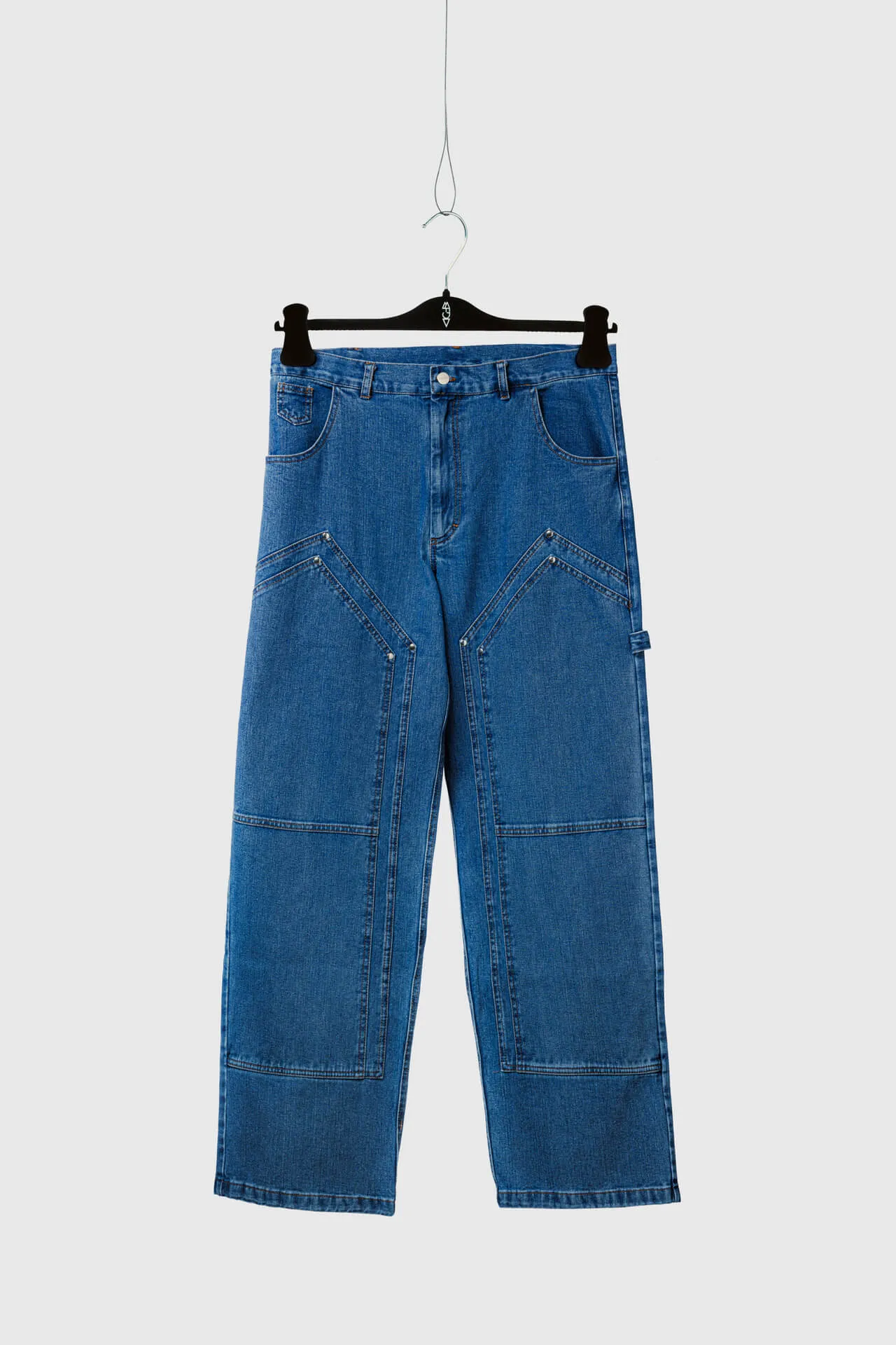 Jeans con costruzione ispirata al workwear in 100% cotone. Tasche utility con cuciture marcate, passante portautensili e rivetti metallici. Etichetta MFGA applicata sul retro. Vestibilità relaxed.