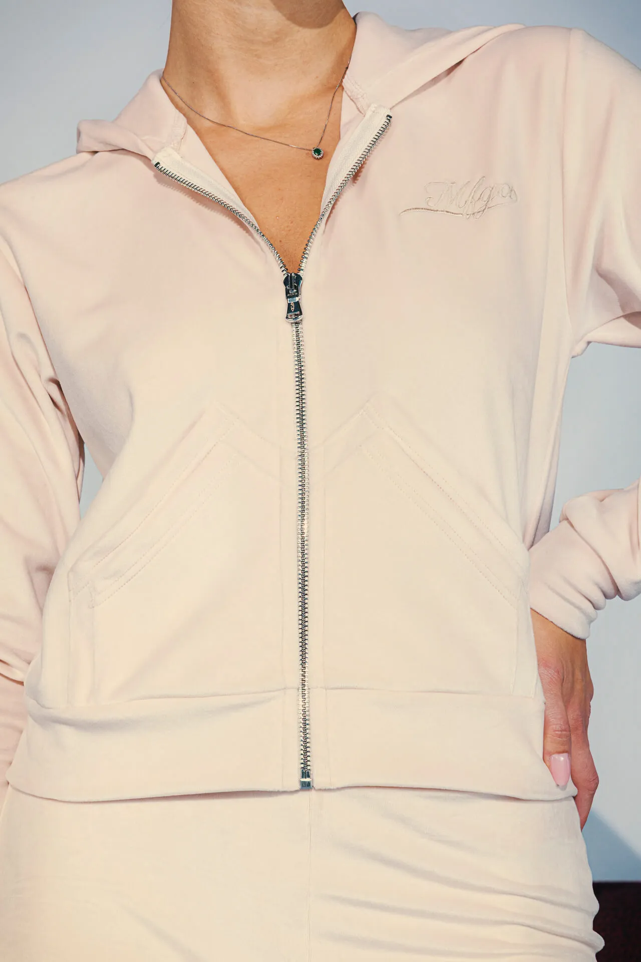 Felpa full zip con cappuccio. Doppia tasca frontale e ricamo MFGA tono su tono sul petto.