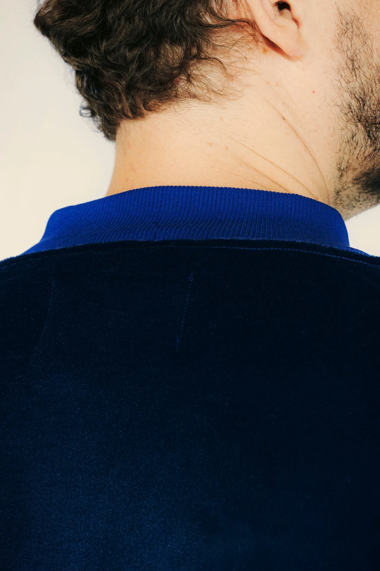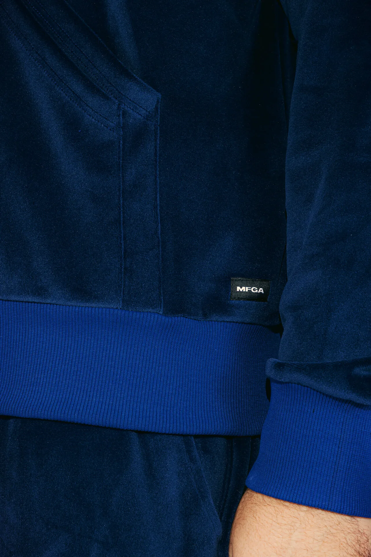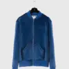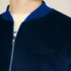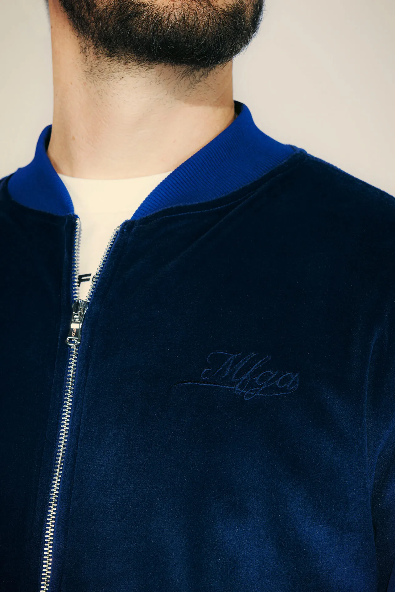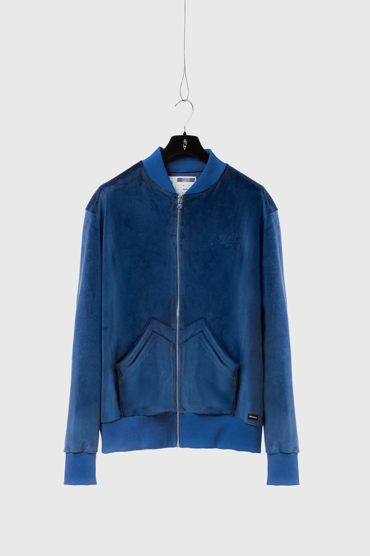 Felpa full zip in velluto azzurro con collo bomber, fondo manica e vita a costine tono su tono. Doppia tasca frontale. Logo MFGA ricamato tono su tono lato cuore.