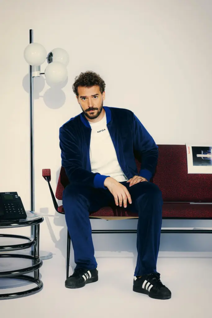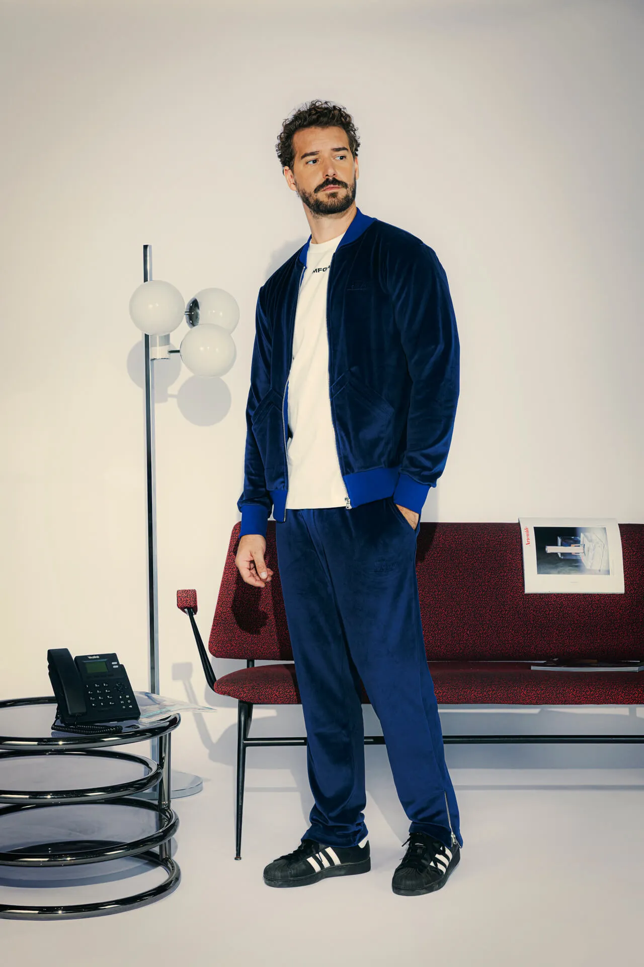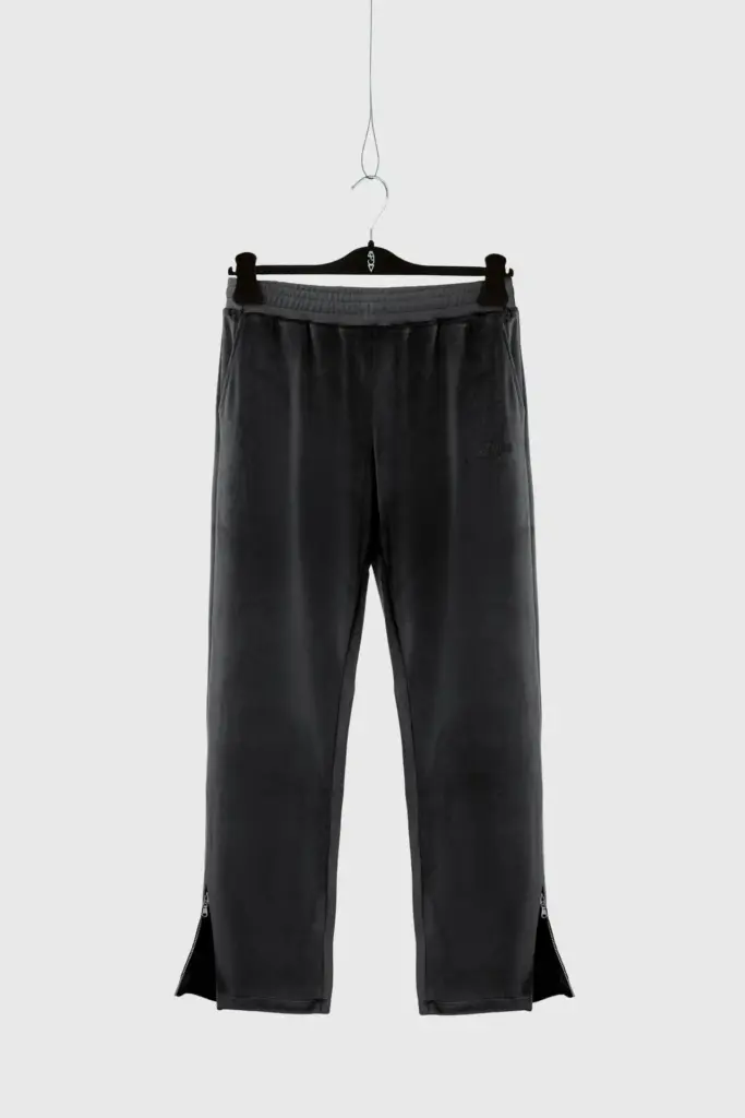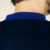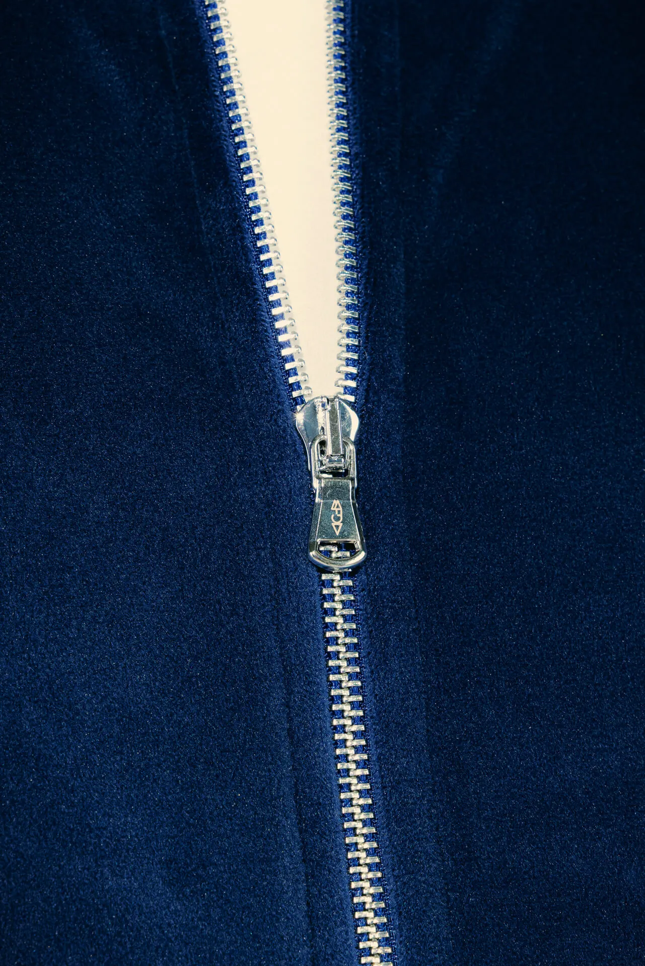 Felpa full zip in velluto azzurro con collo bomber, fondo manica e vita a costine tono su tono. Doppia tasca frontale. Logo MFGA ricamato tono su tono lato cuore.
