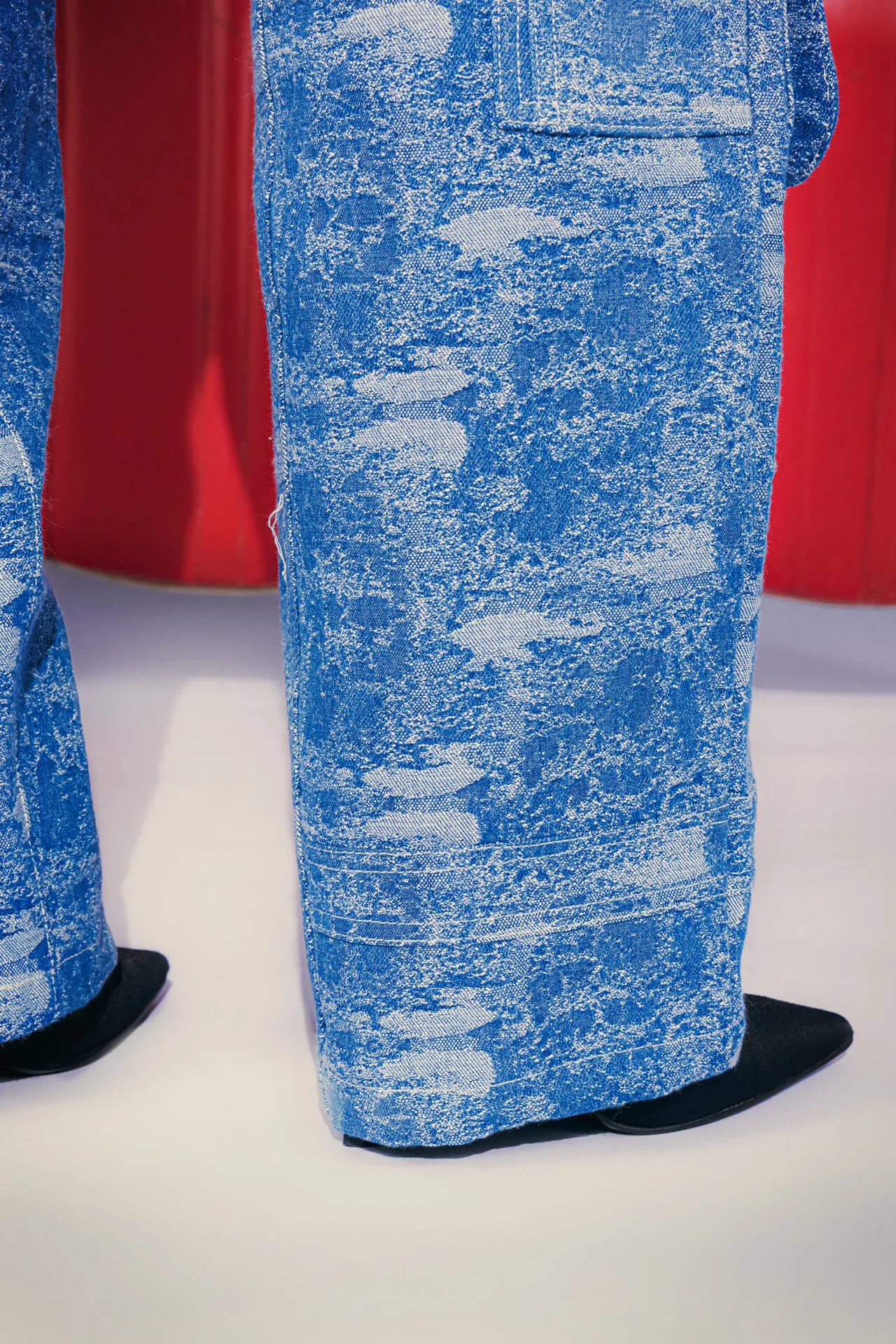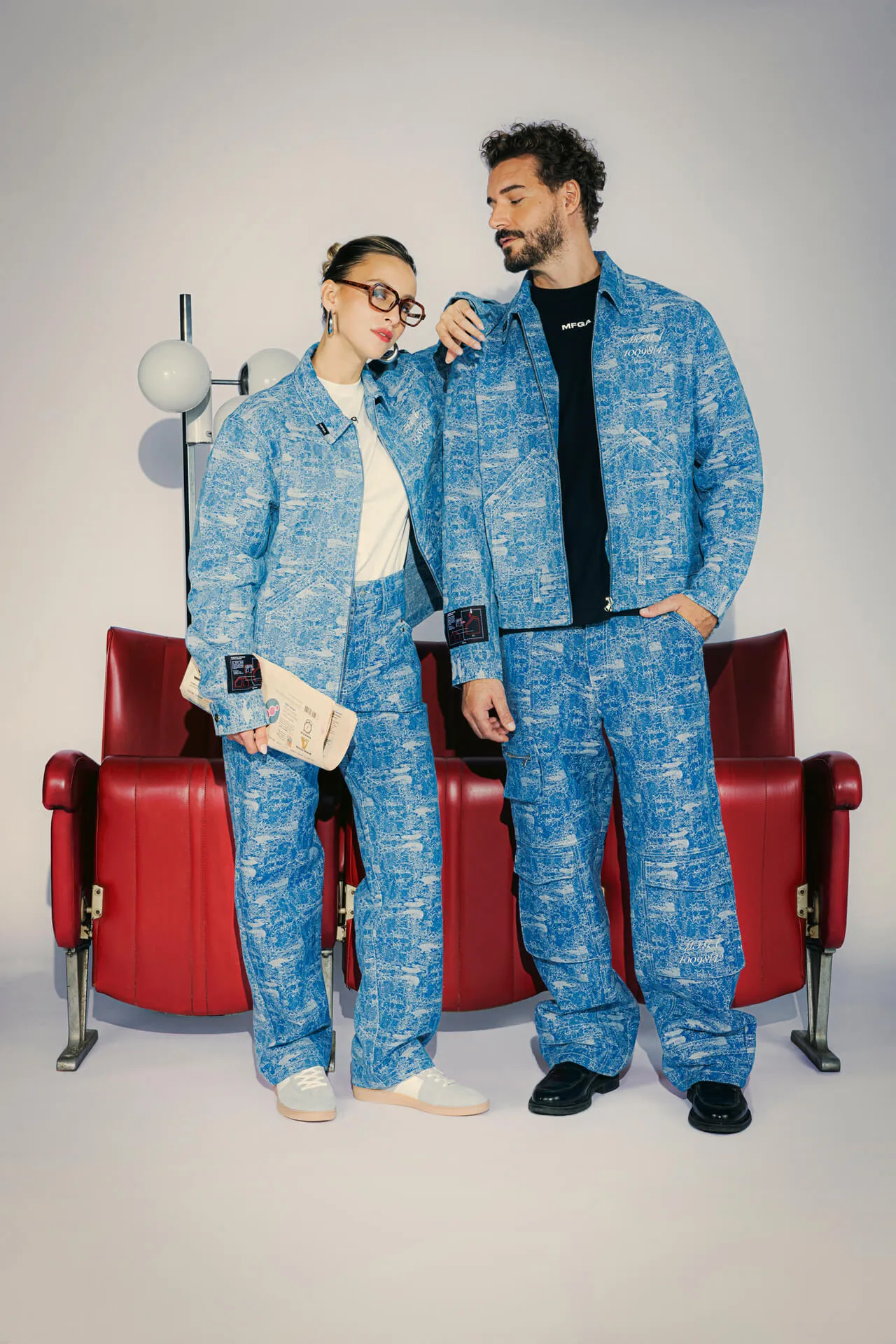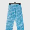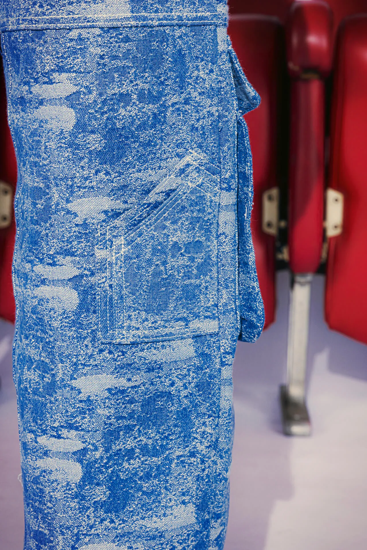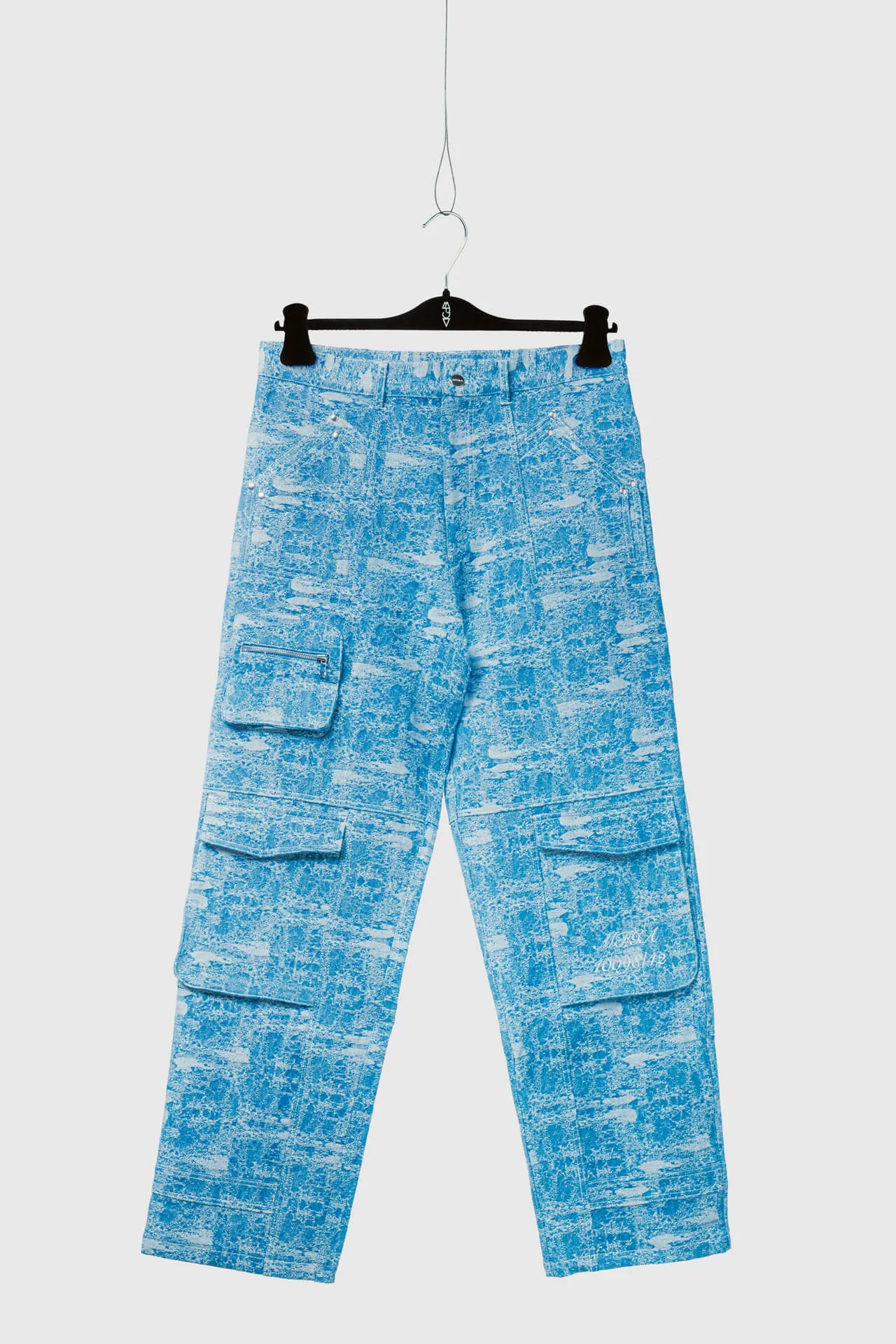 Pantaloni cargo in 100% cotone denim. Tasche applicate, chiusura zip e bottone. Ricamo MFGA sul lato e label applicata sul retro.
