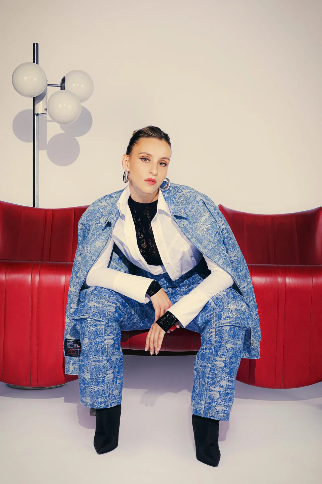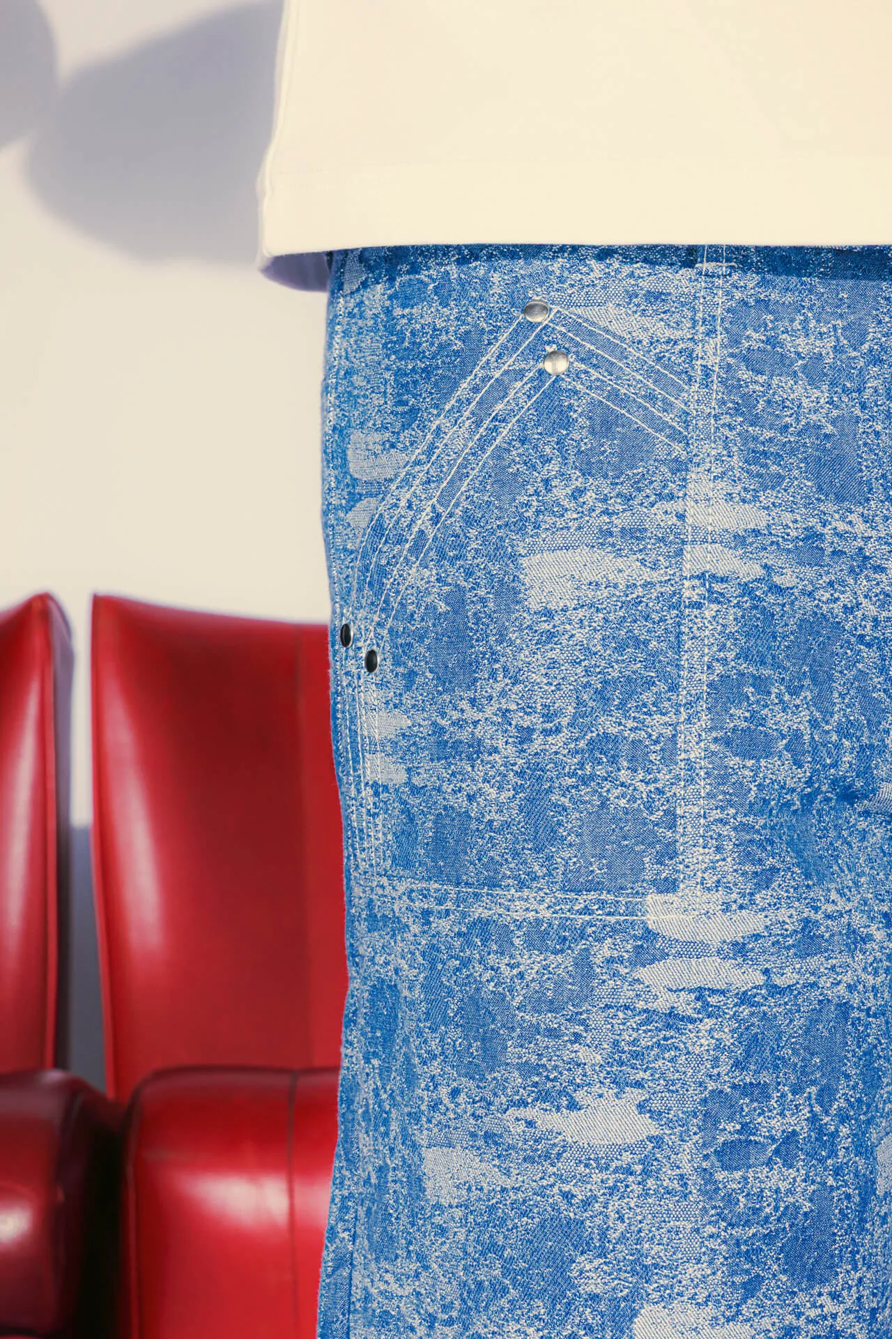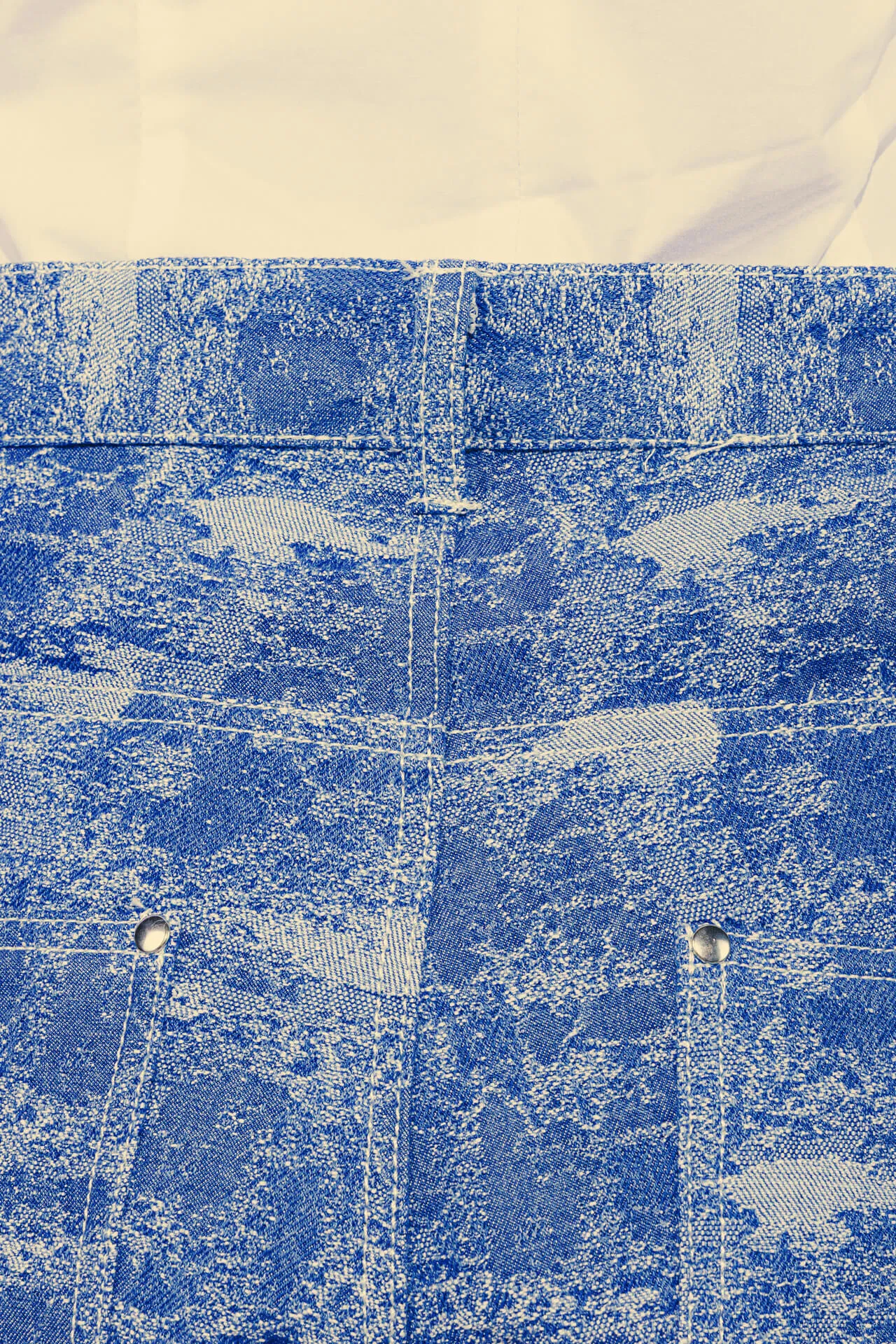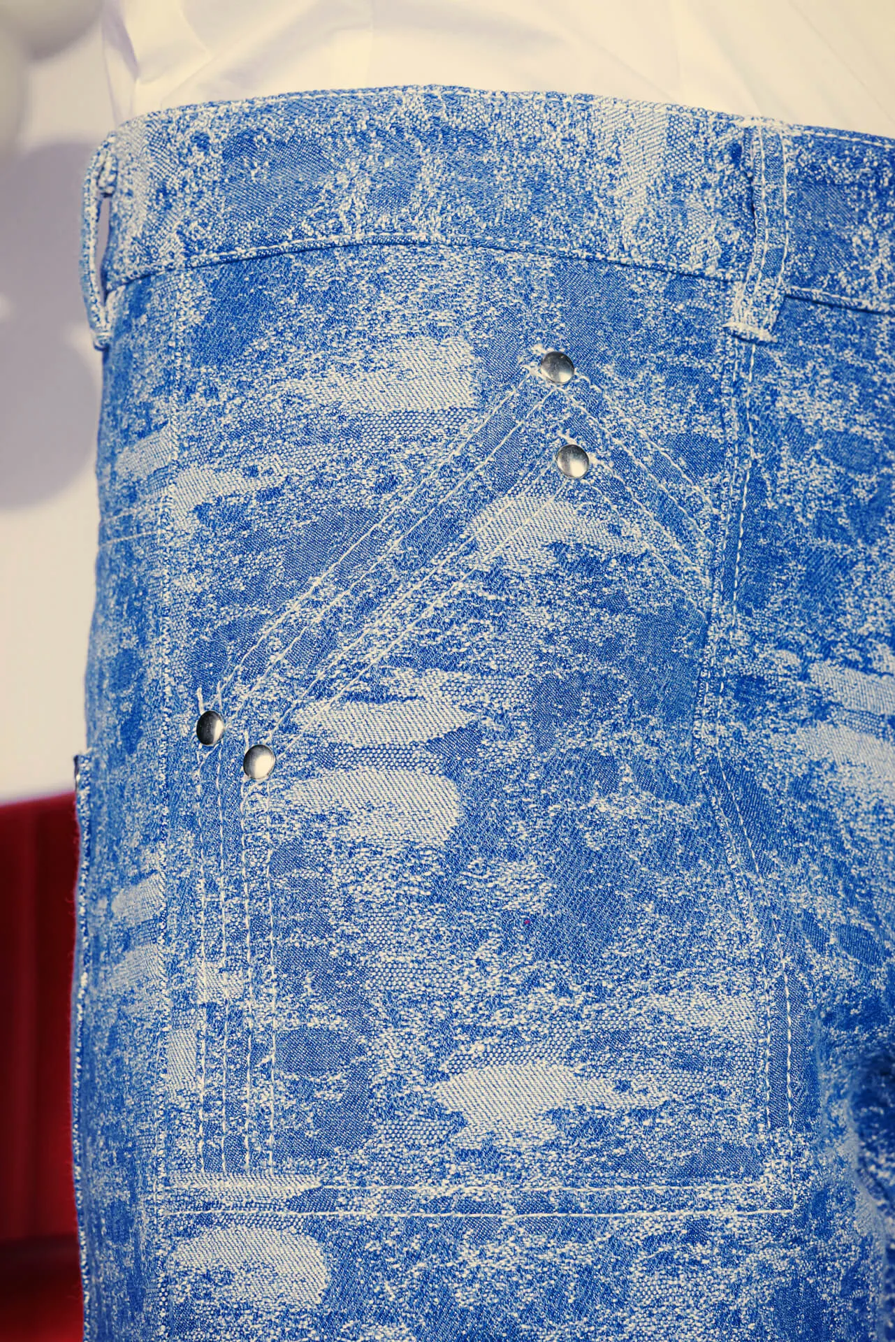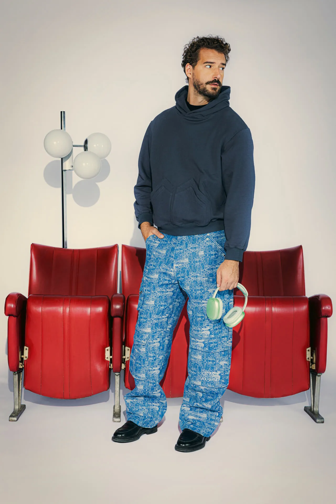 Pantaloni cargo in 100% cotone denim. Tasche applicate, chiusura zip e bottone. Ricamo MFGA sul lato e label applicata sul retro.