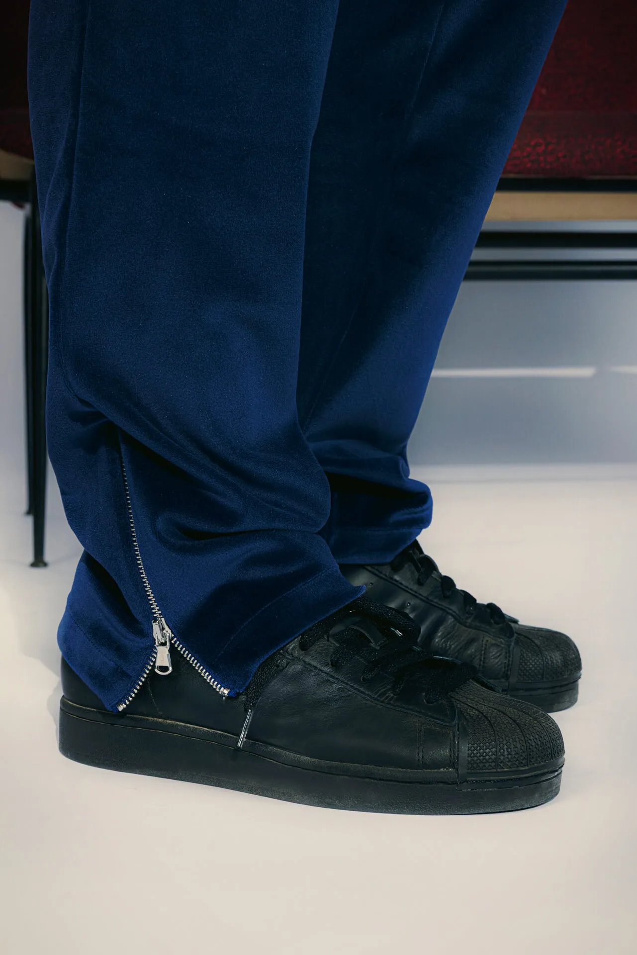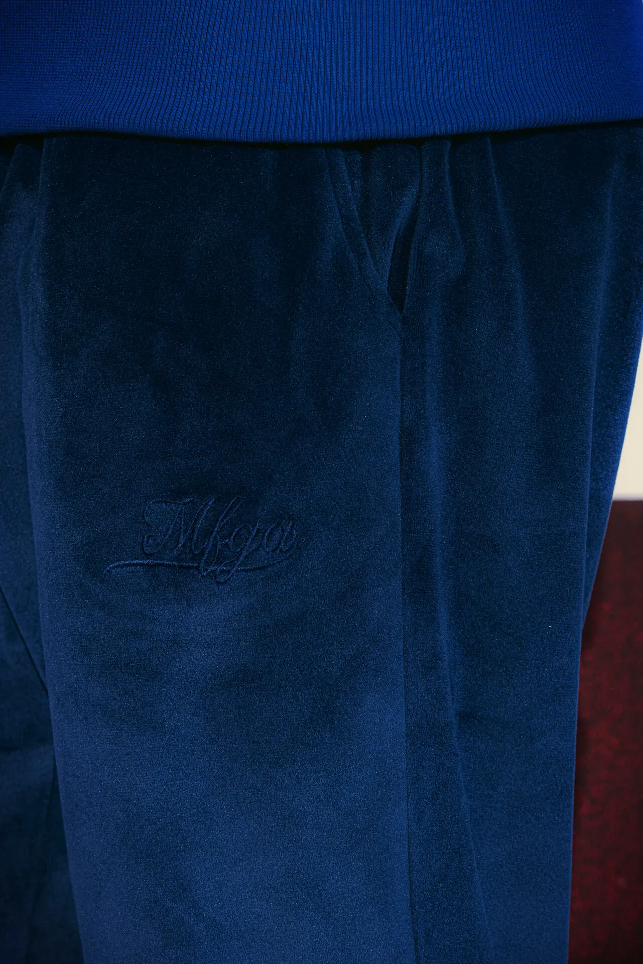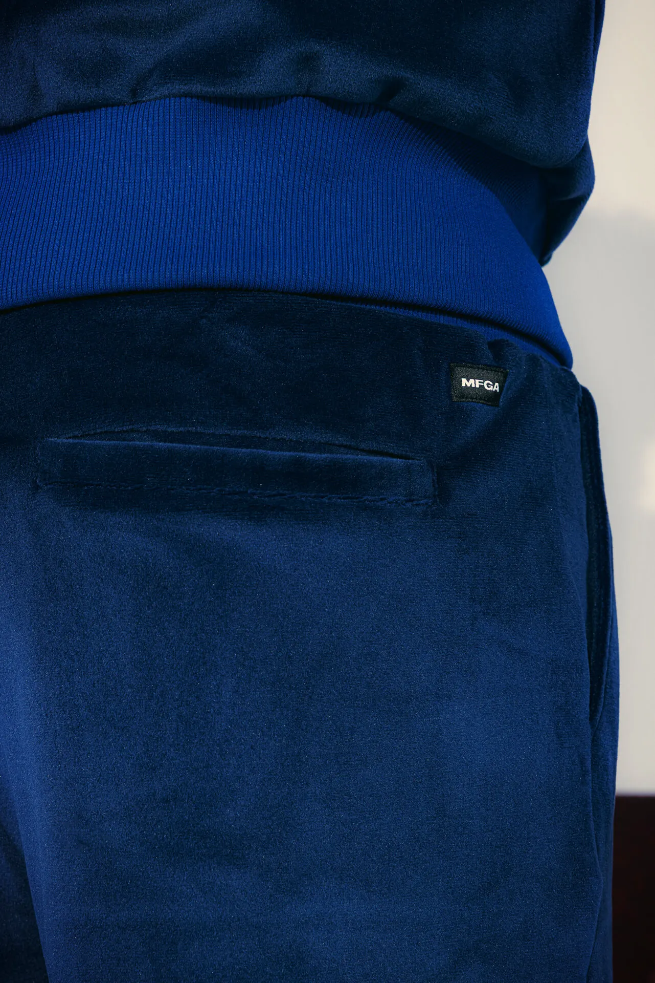 Pantaloni in velluto con elastico in vita e fondo gamba con zip. Dettaglio ricamo MFGA tono su tono sul fianco. Tasca posteriore a filetto.
