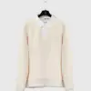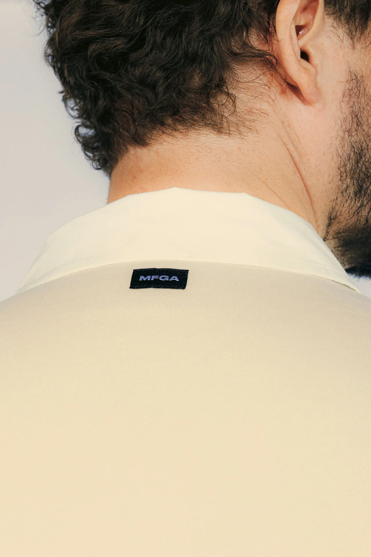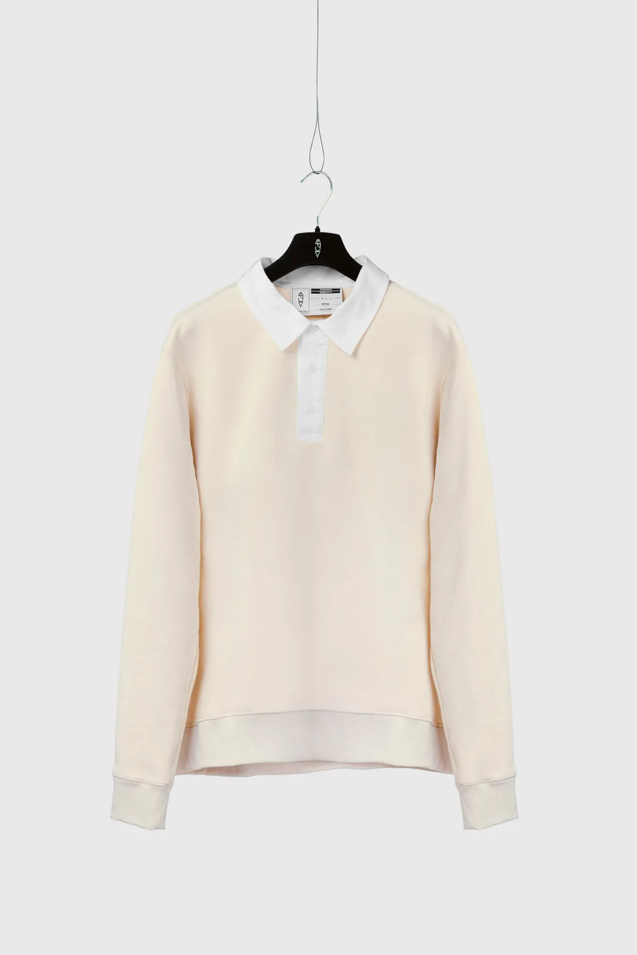 Felpa a maniche lunghe in 100% cotone con colletto in popeline e chiusura con bottoni. Logo MFGA tono su tono ricamato sul petto. Collo e abbottonatura ispirati alla camicia da ufficio, per chi non vuole rinunciare allo stile neanche tra una call e l’altra. Vestibilità regular.