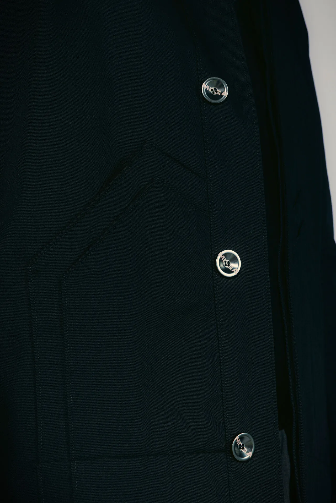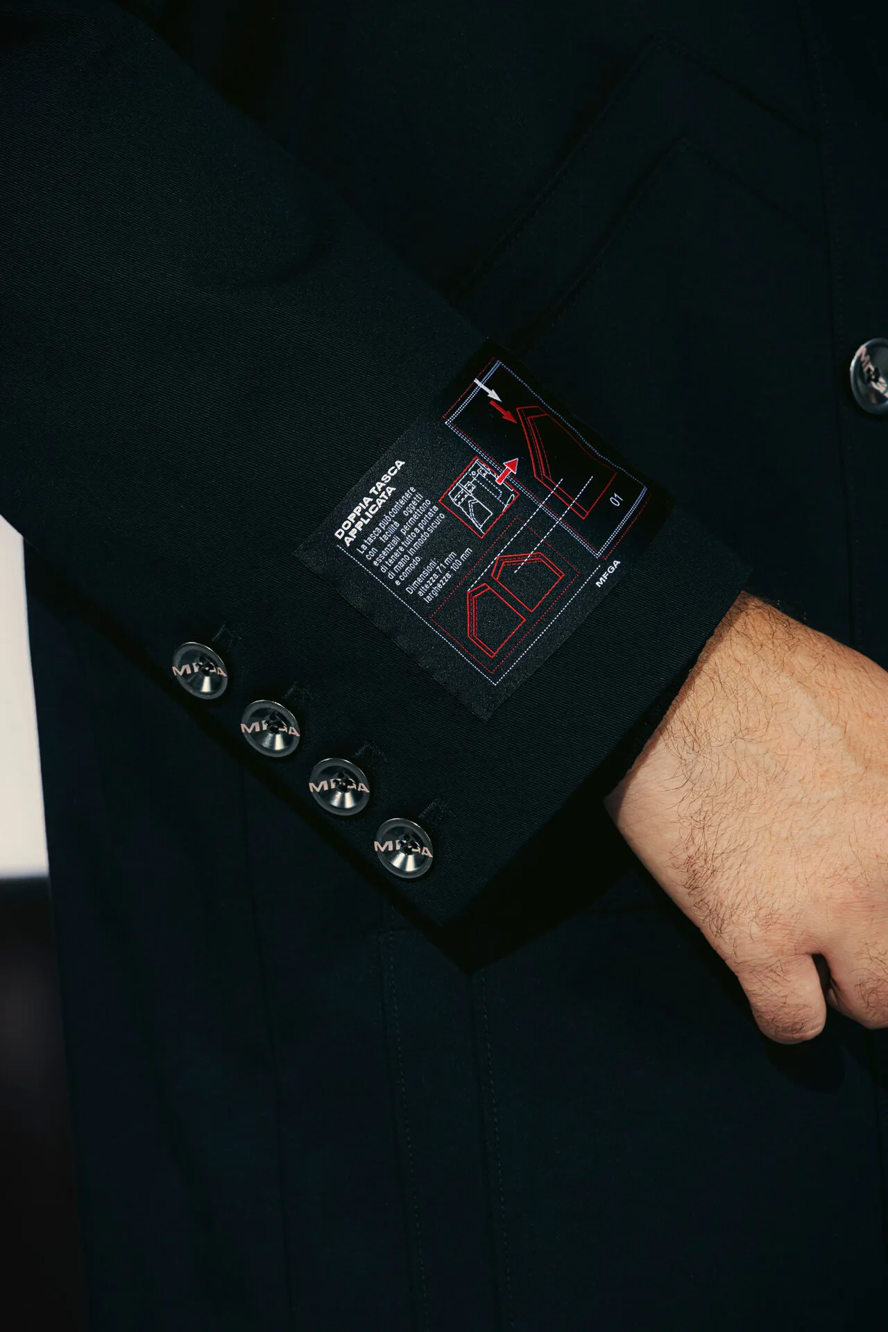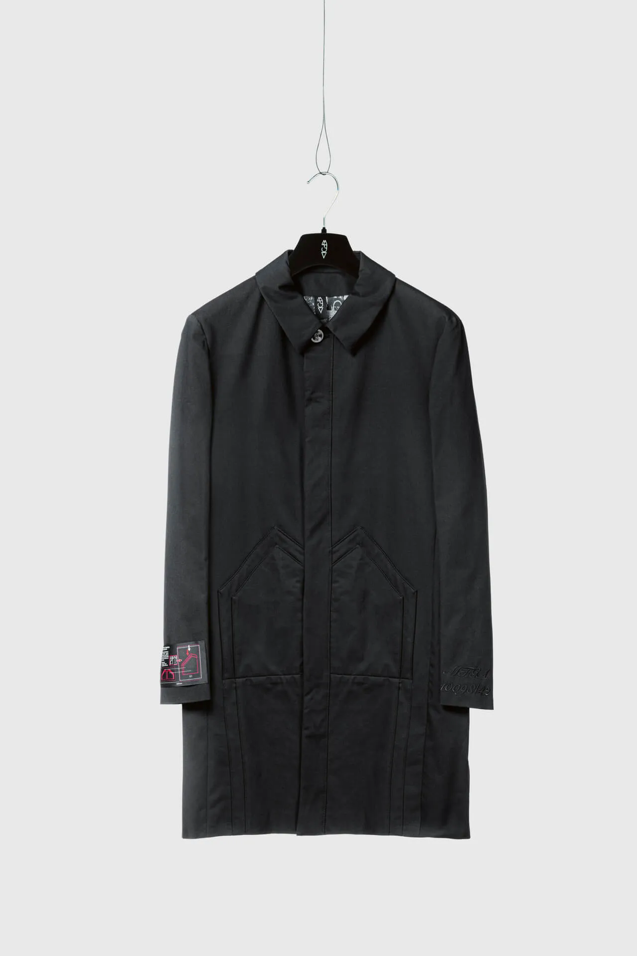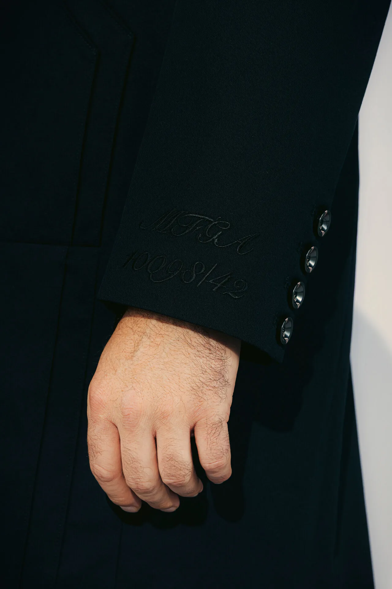 Cappotto monopetto 100% cotone con chiusura frontale nascosta e colletto classico. Doppie tasche frontali applicate con doppia impuntura. Ricamo MFGA 10098/42 sul polsino sinistro e label tecnica applicata sul polsino destro. Interno foderato 100% poliestere con pattern grafico ispirato a Rivoli. Vestibilità regular.