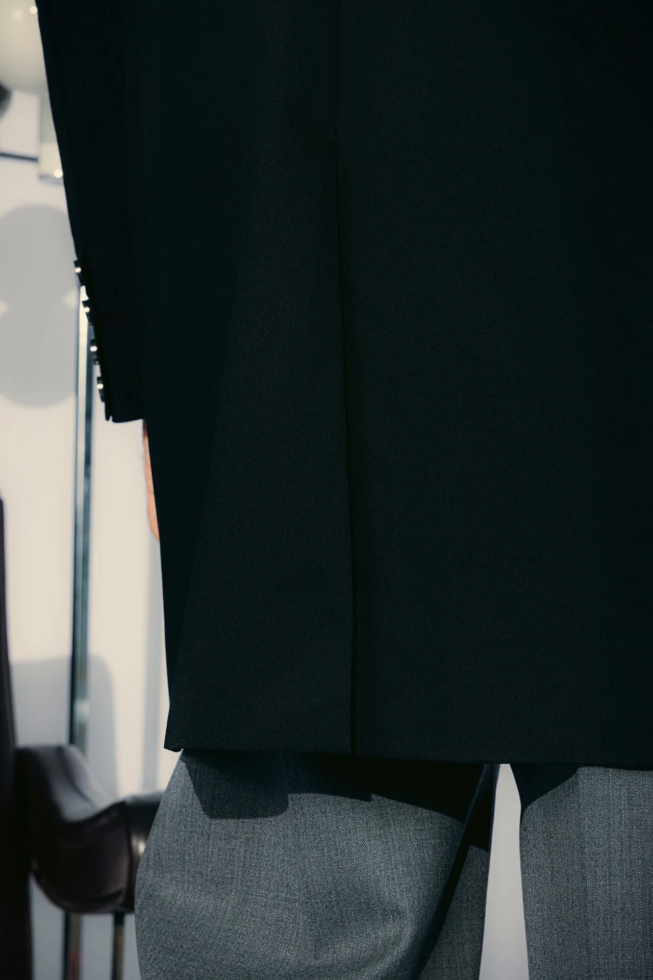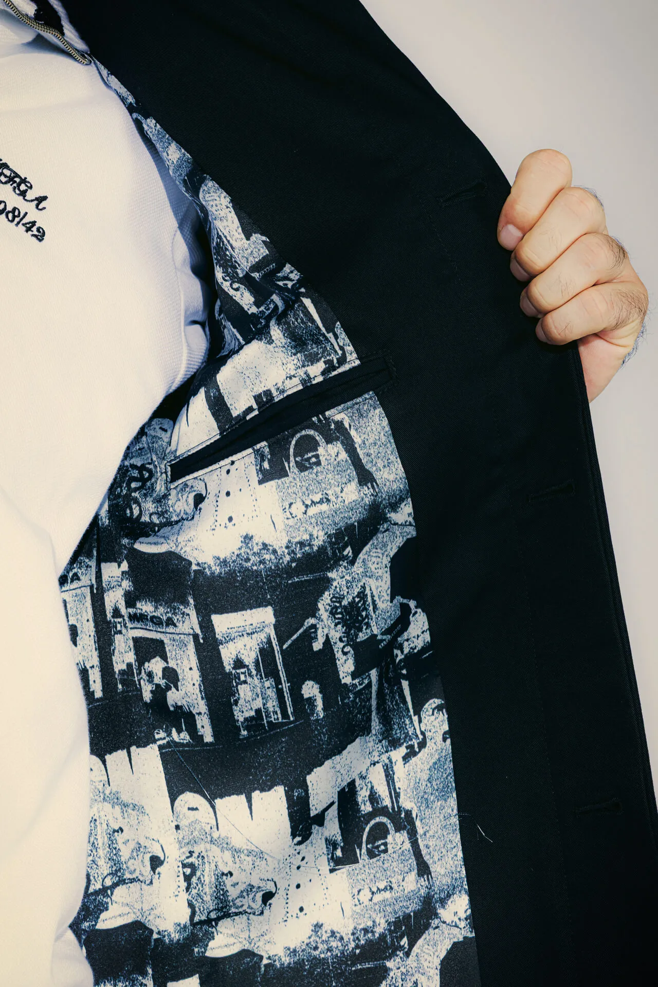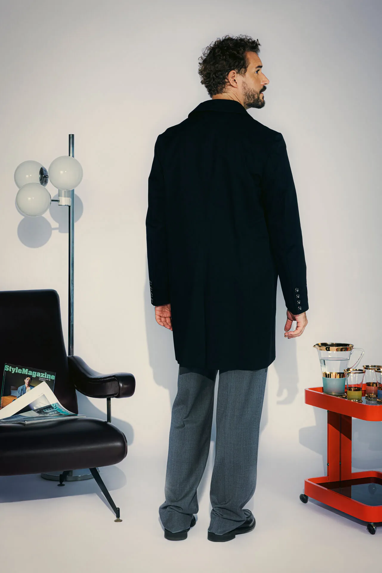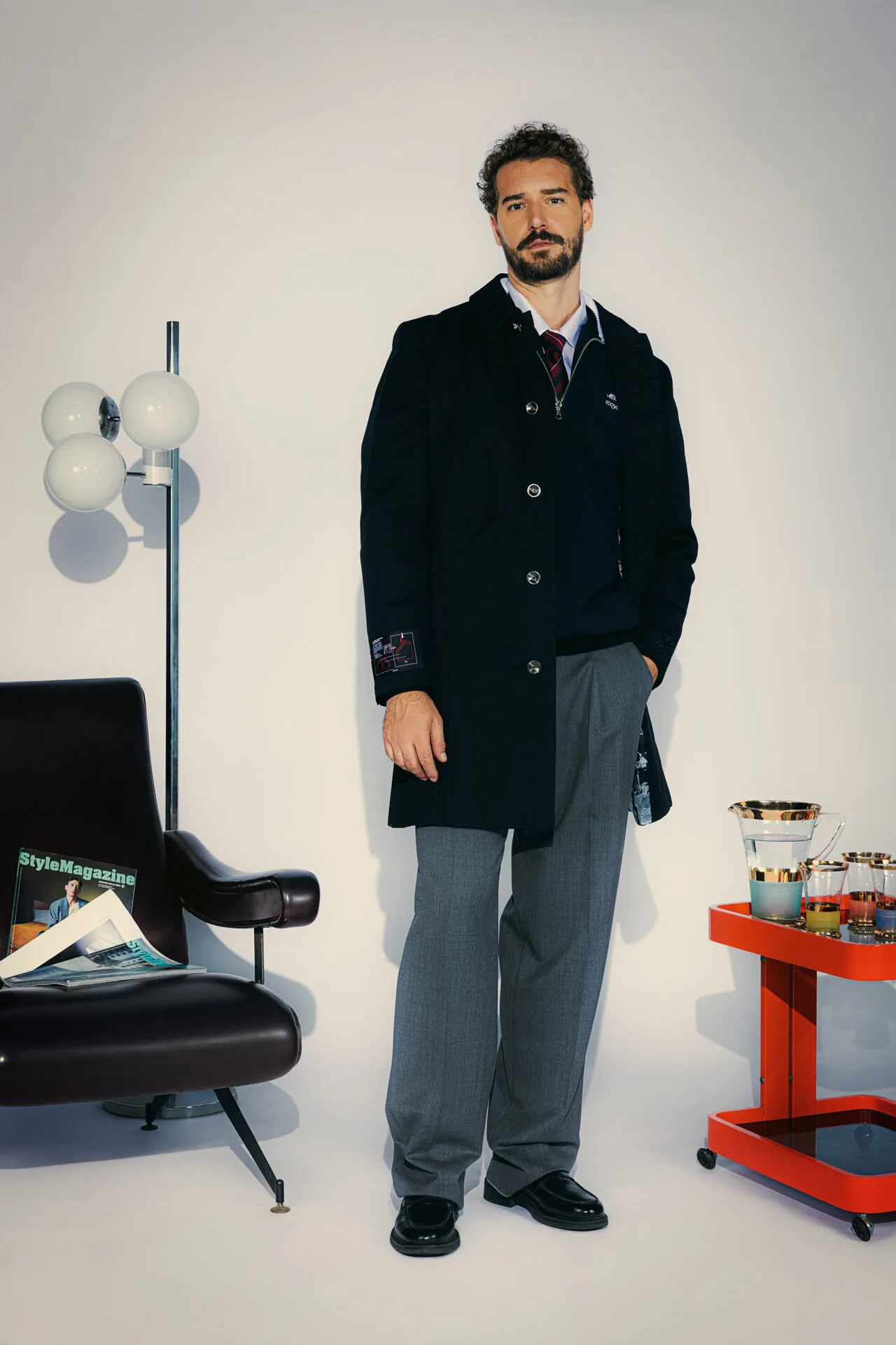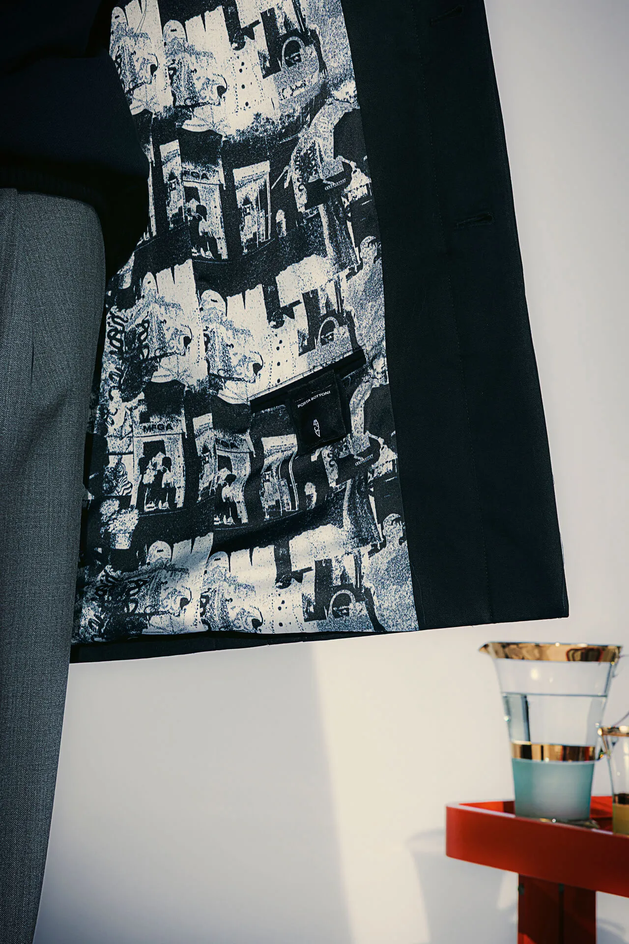 Cappotto monopetto 100% cotone con chiusura frontale nascosta e colletto classico. Doppie tasche frontali applicate con doppia impuntura. Ricamo MFGA 10098/42 sul polsino sinistro e label tecnica applicata sul polsino destro. Interno foderato 100% poliestere con pattern grafico ispirato a Rivoli. Vestibilità regular.