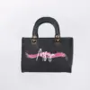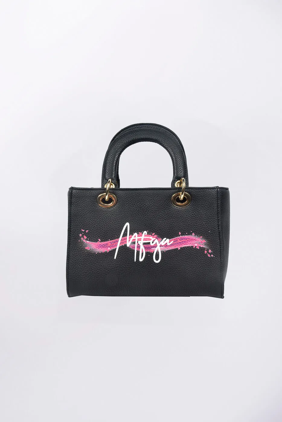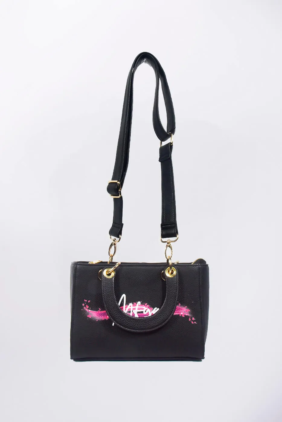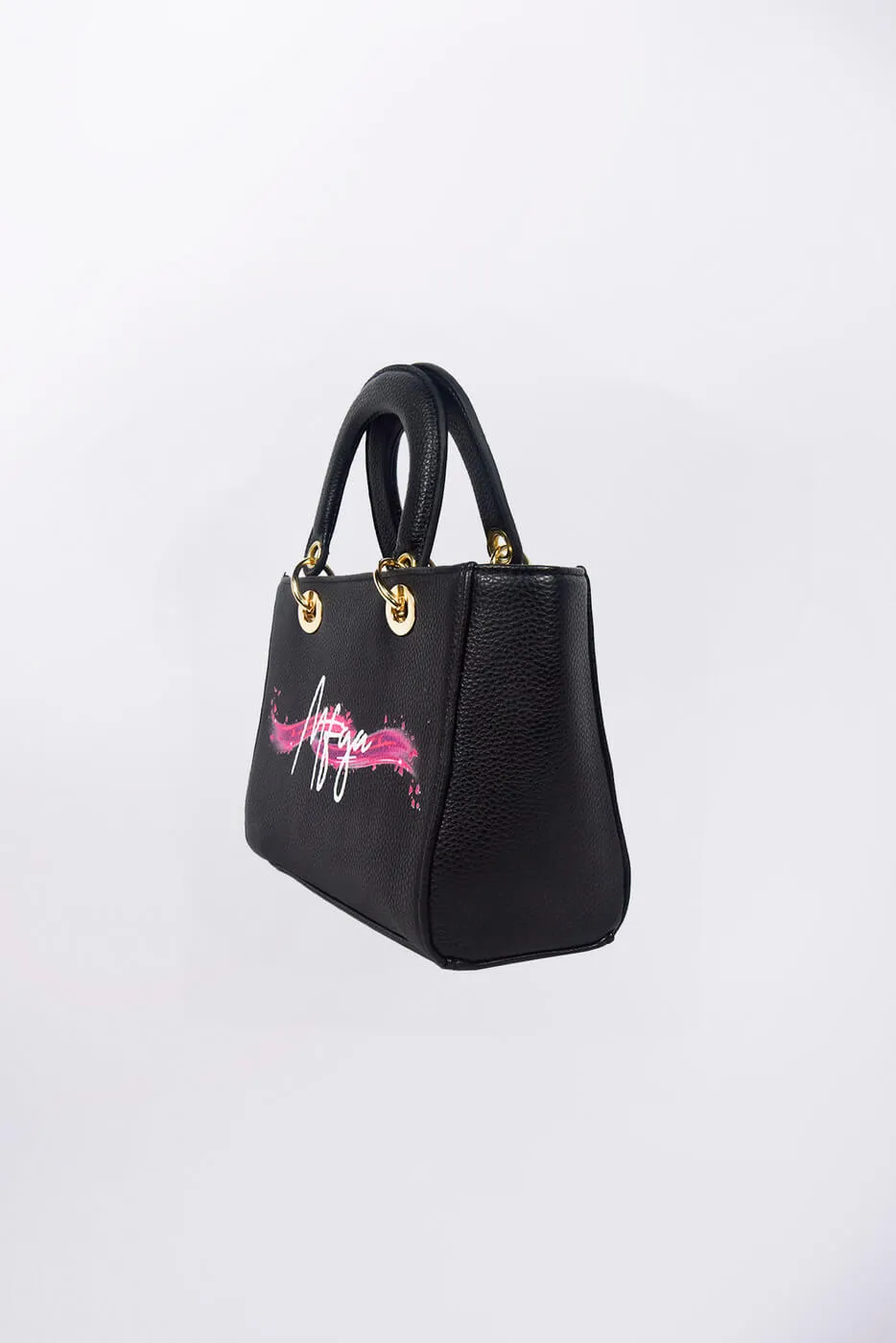 Mini bag strutturata in pelle martellata nera con doppi manici e tracolla regolabile e rimovibile. Chiusura con zip dorata, piedini metallici sul fondo e stampa grafica con pennellata rosa fluo e logo MFGA effetto handwriting. Interno foderato con tasca con zip.