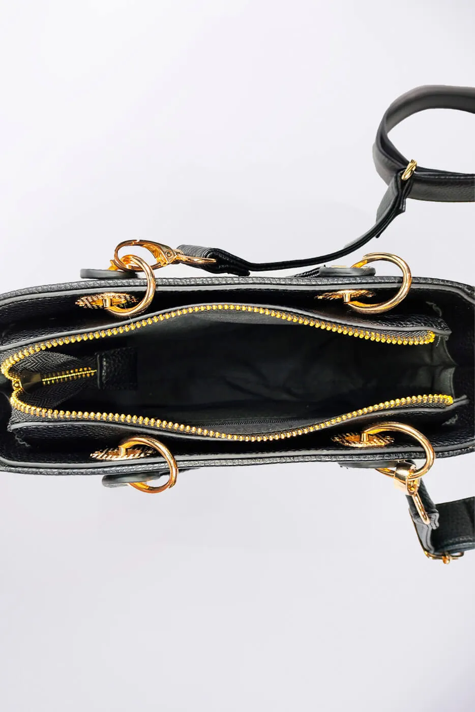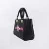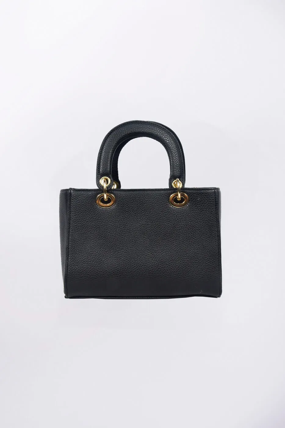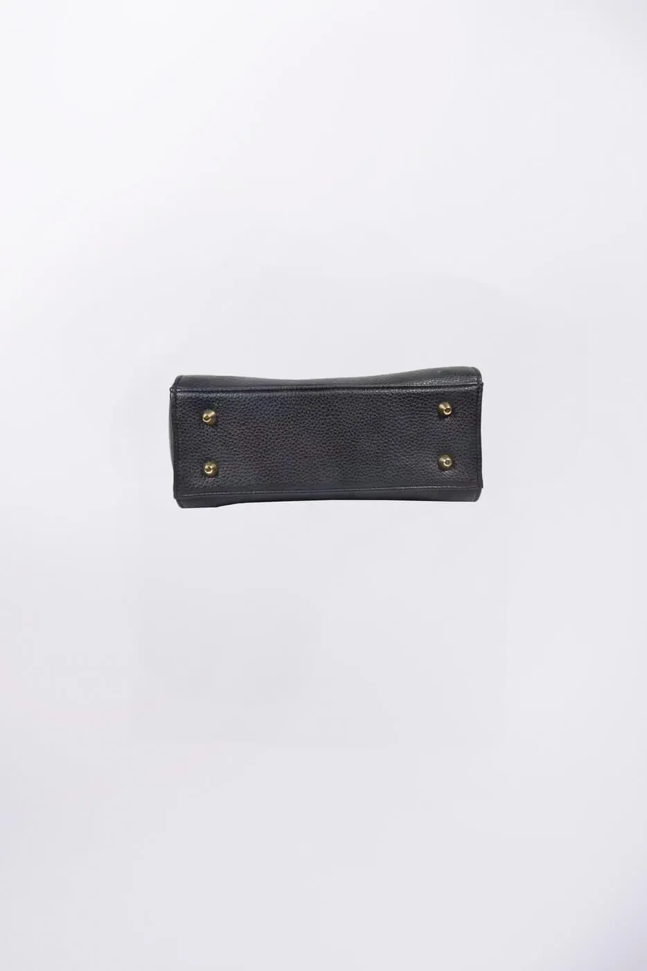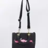 Mini bag strutturata in pelle martellata nera con doppi manici e tracolla regolabile e rimovibile. Chiusura con zip dorata, piedini metallici sul fondo e stampa grafica con pennellata rosa fluo e logo MFGA effetto handwriting. Interno foderato con tasca con zip.