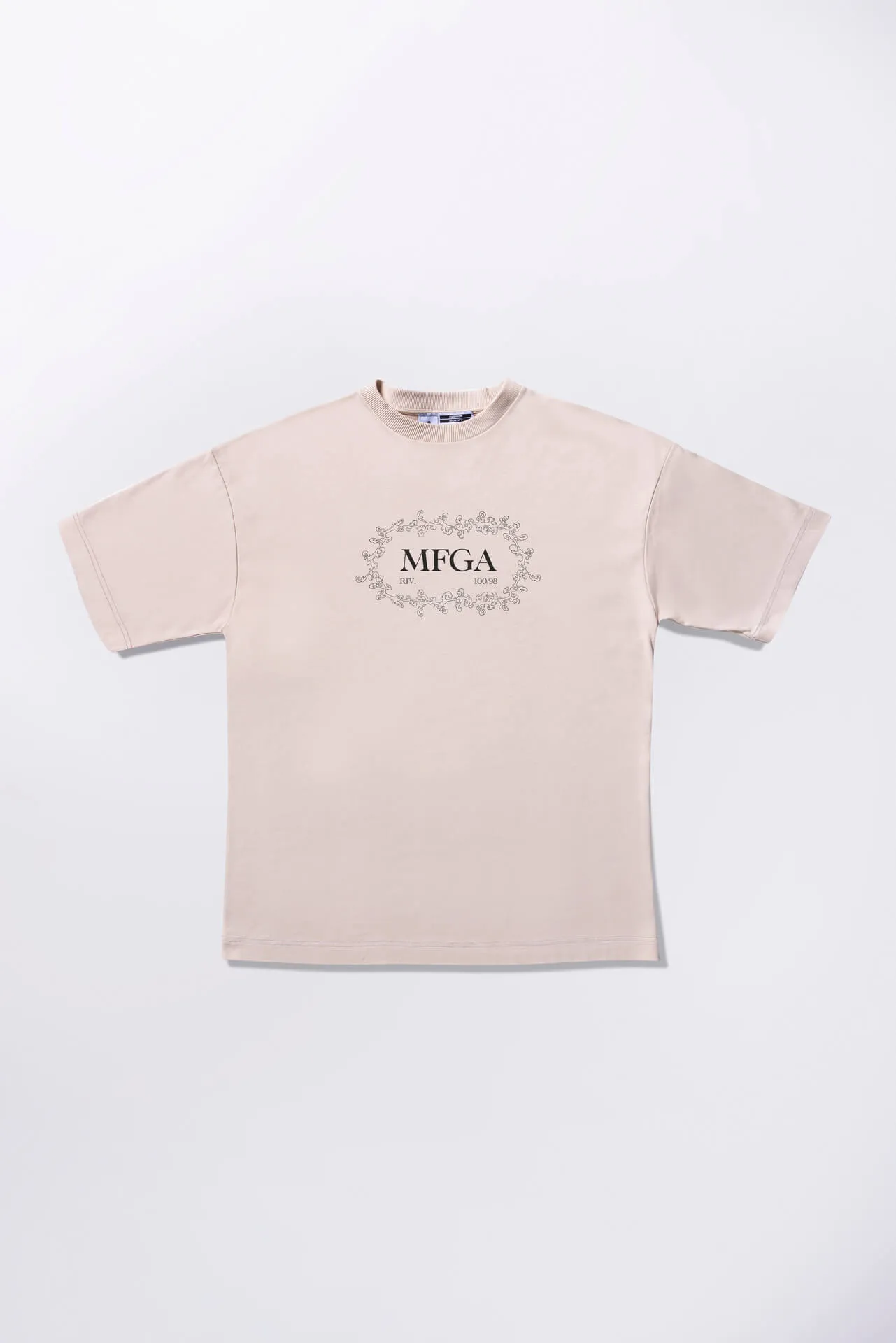 T-shirt a maniche corte in 100% cotone con stampa centrale “MFGA” incorniciata da un disegno floreale ornamentale.