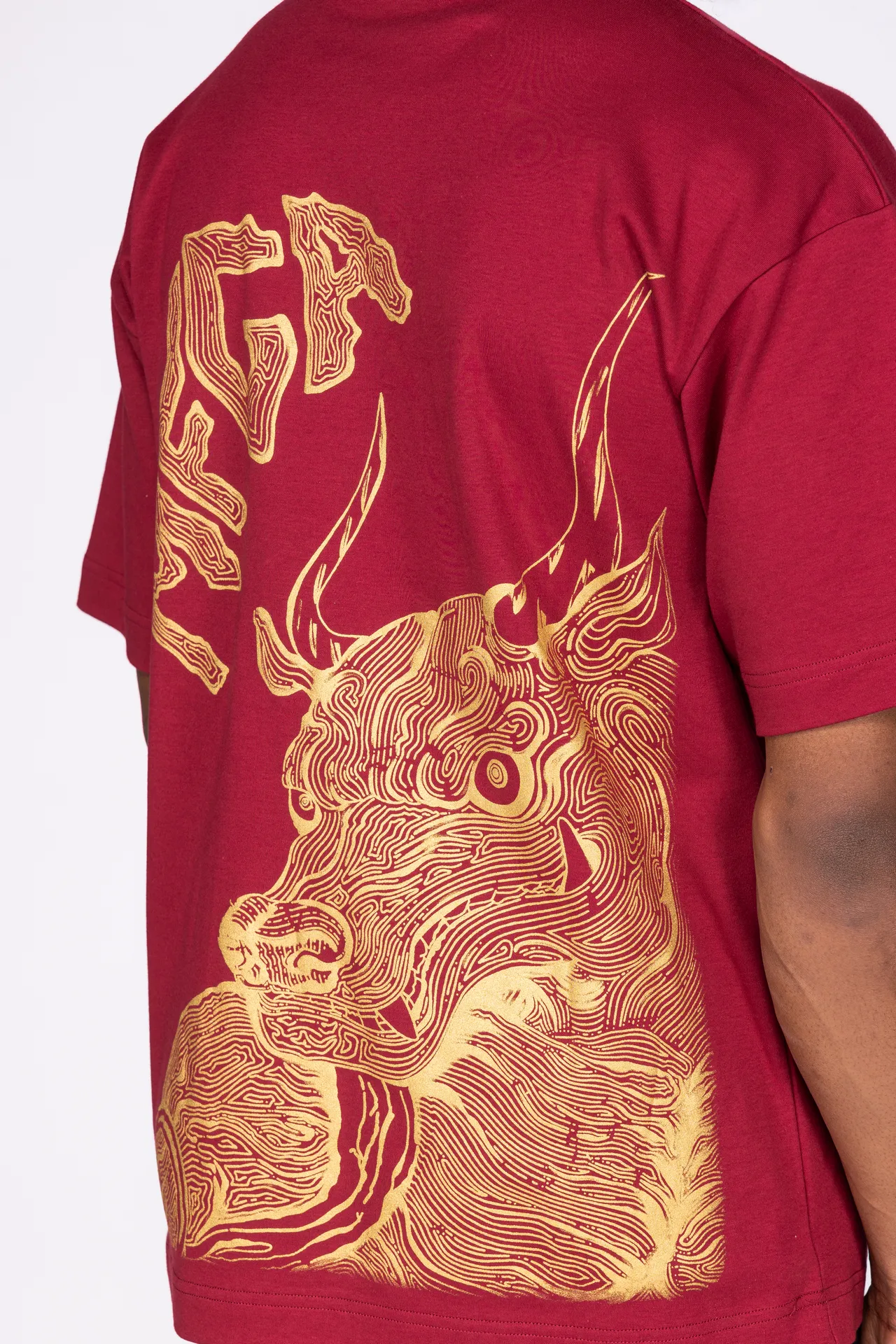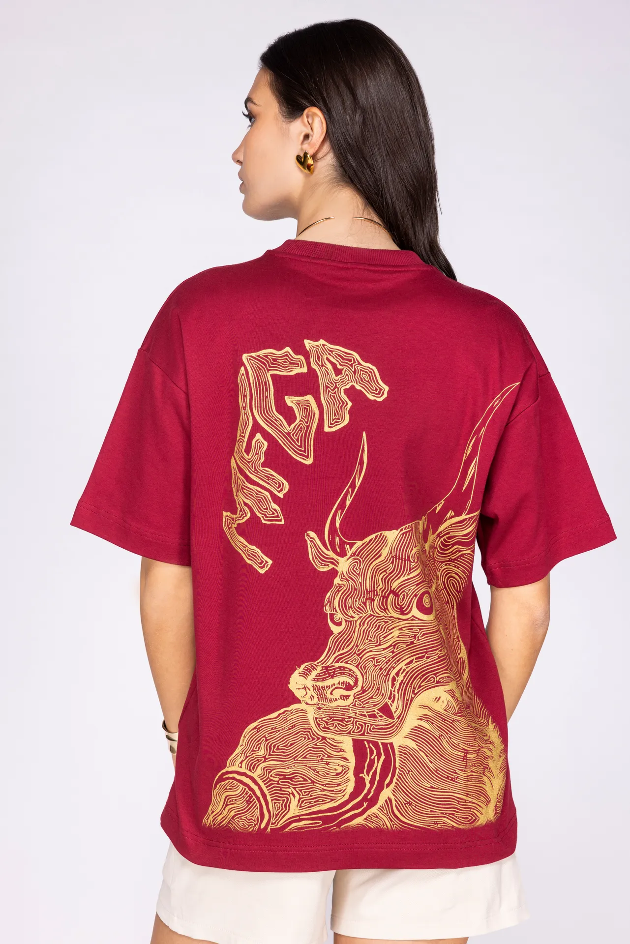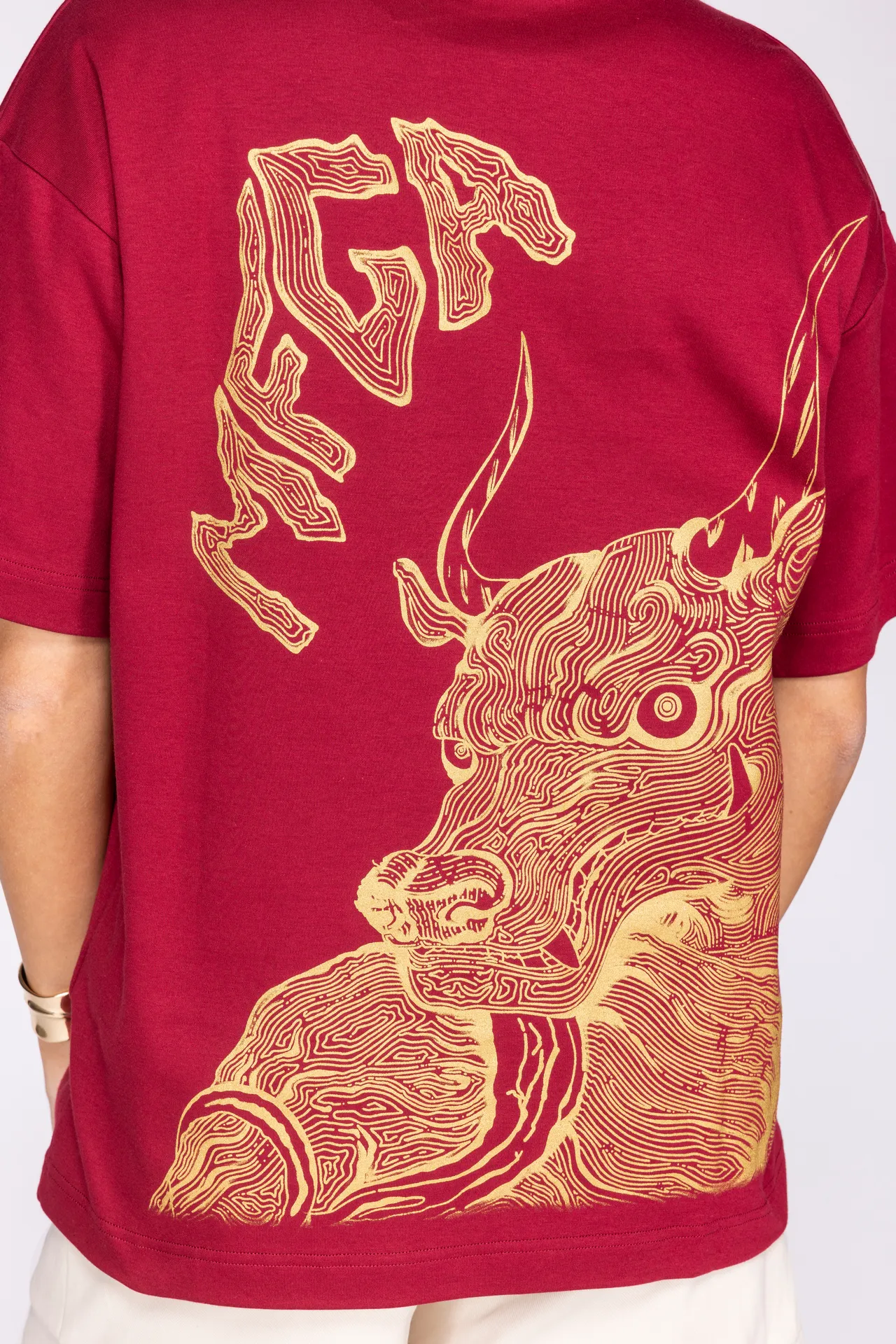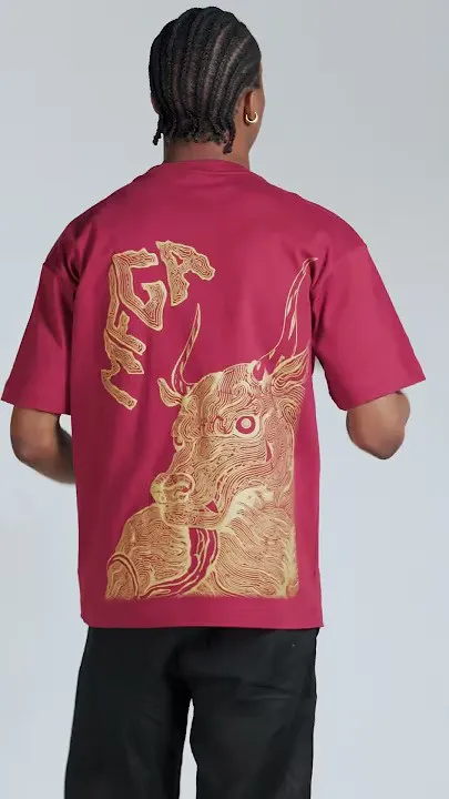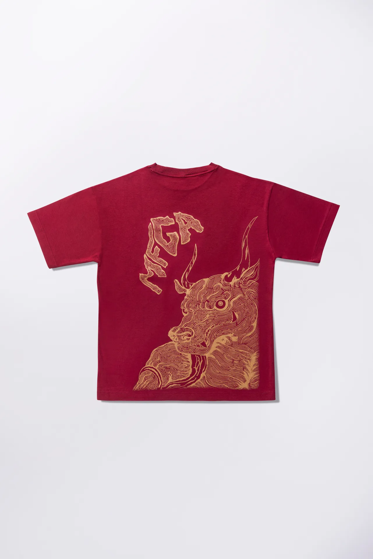 T-shirt unisex in 100% cotone con stampa rossa a contrasto. Sul fronte è presente un motivo grafico posizionato sul petto, mentre sul retro campeggia una grande illustrazione in stile grafico con lettering “MFGA”. Collo a costine e vestibilità regular.