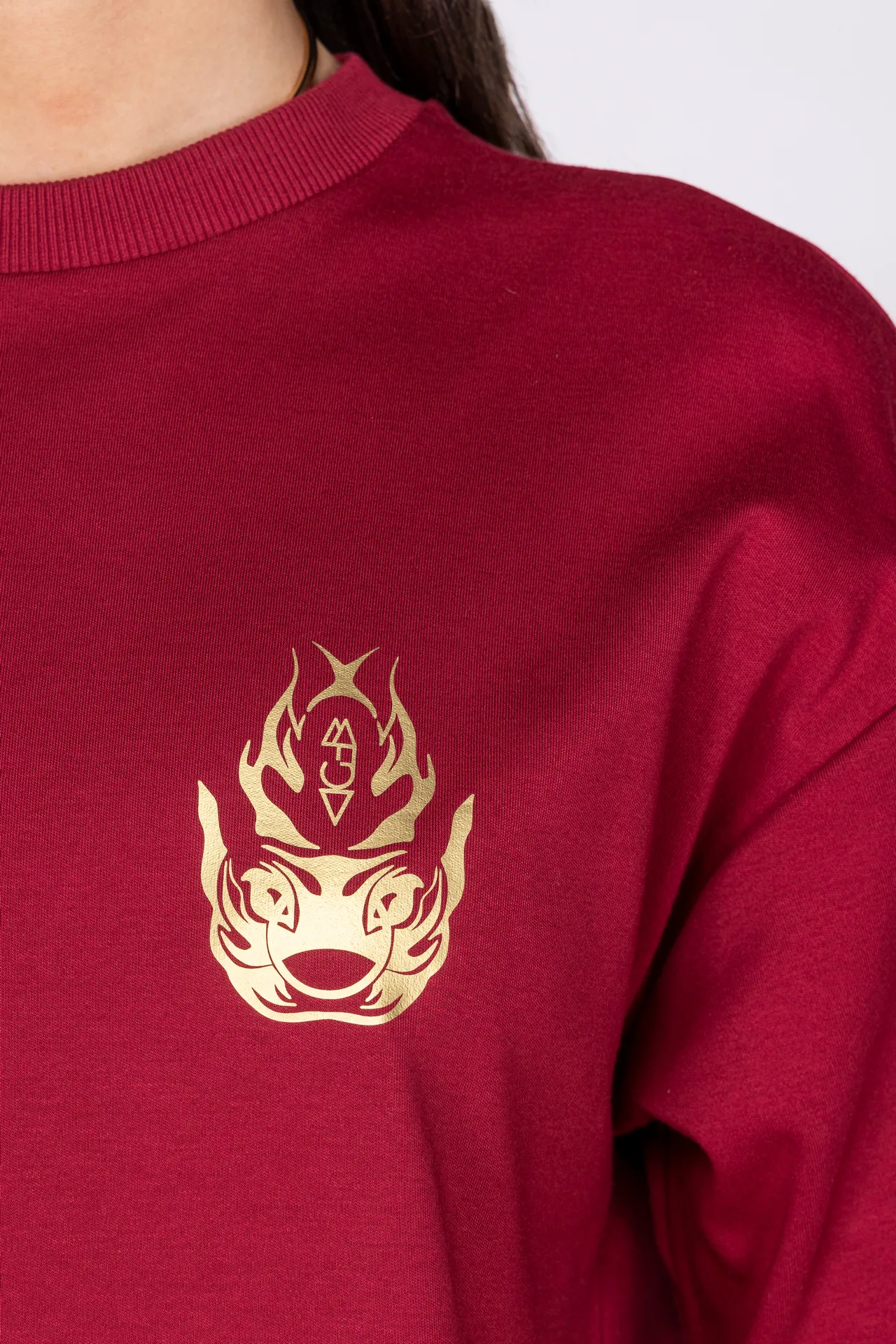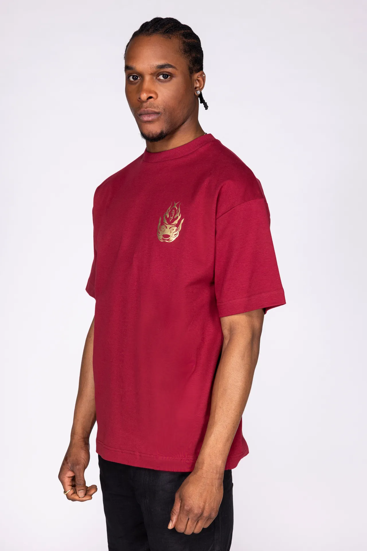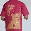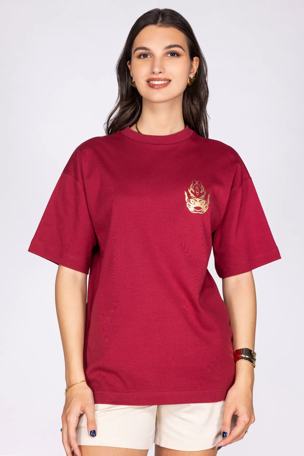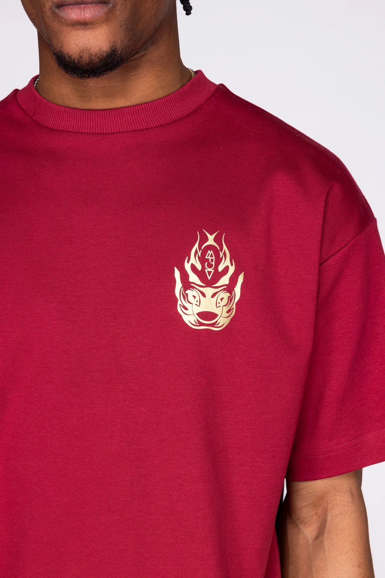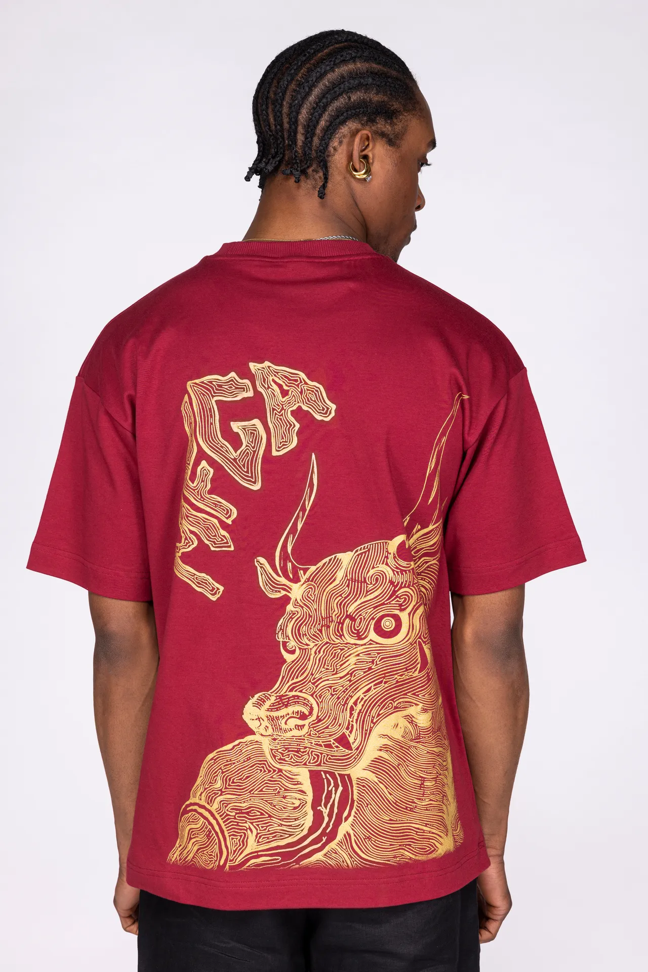 T-shirt unisex in 100% cotone con stampa rossa a contrasto. Sul fronte è presente un motivo grafico posizionato sul petto, mentre sul retro campeggia una grande illustrazione in stile grafico con lettering “MFGA”. Collo a costine e vestibilità regular.