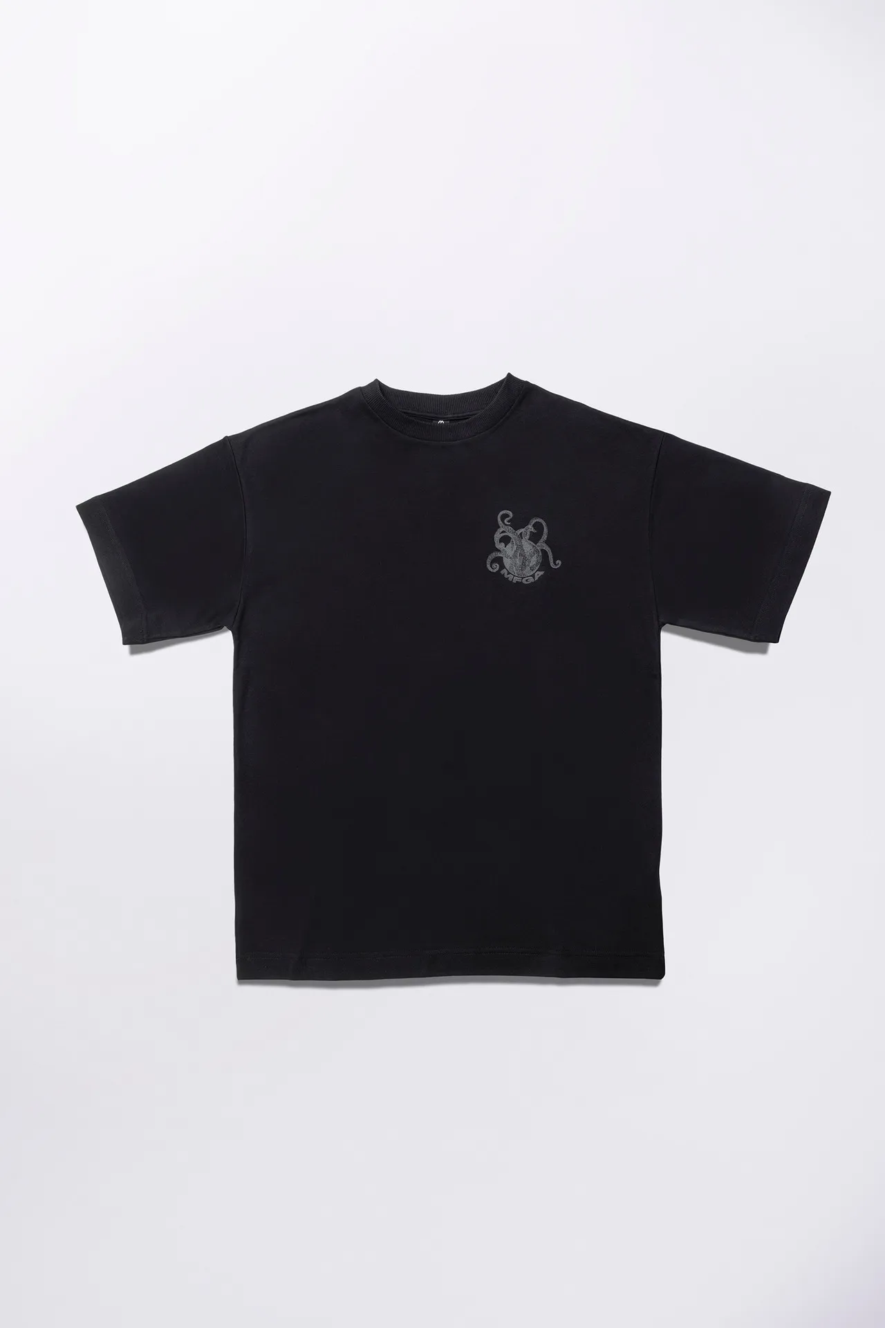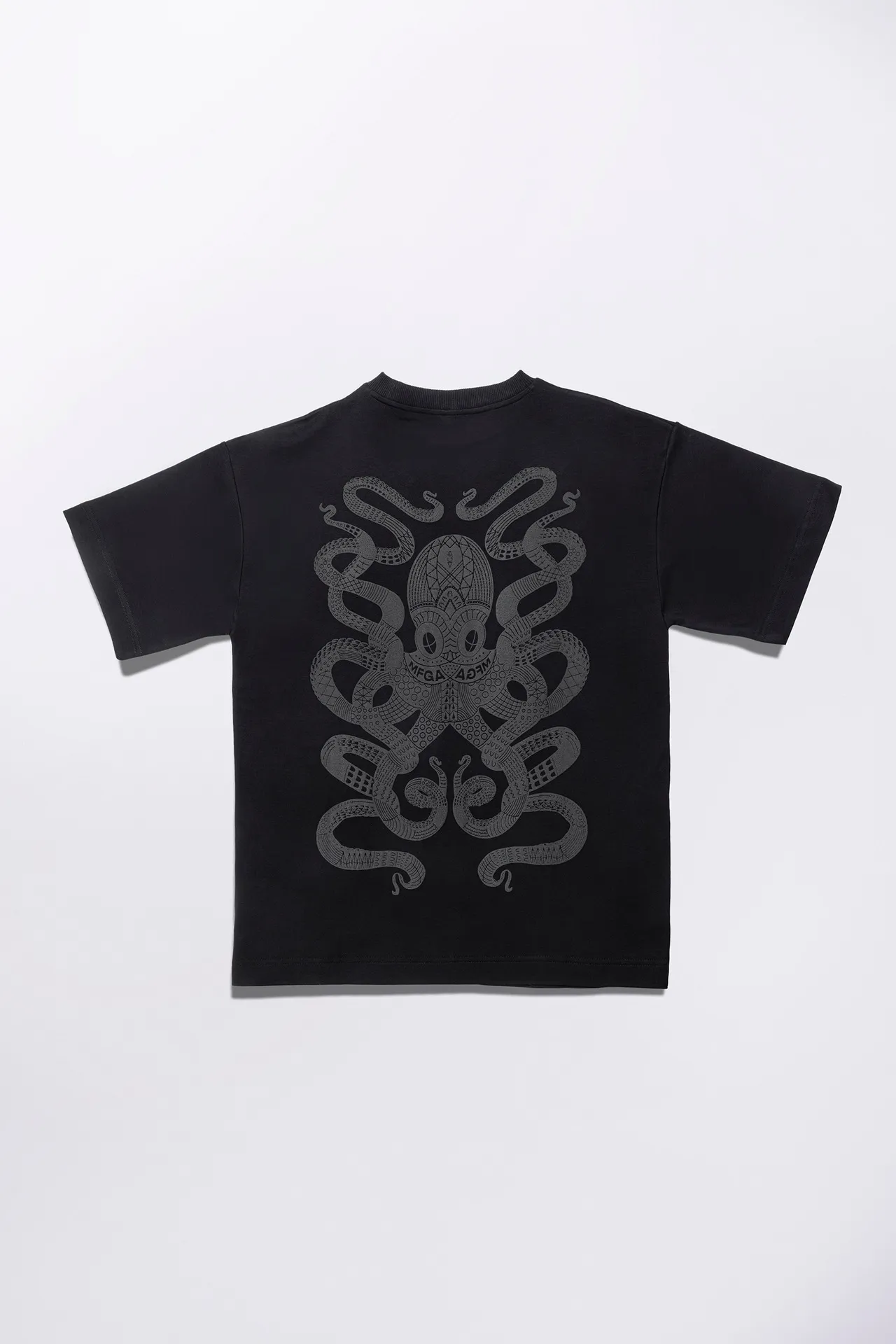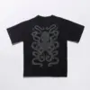 T-shirt girocollo a maniche corte in 100% cotone, caratterizzata da una stampa grafica originale sul petto e un’illustrazione di grande impatto stampata sul retro. Vestibilità regular e finiture pulite per un capo versatile e distintivo.
