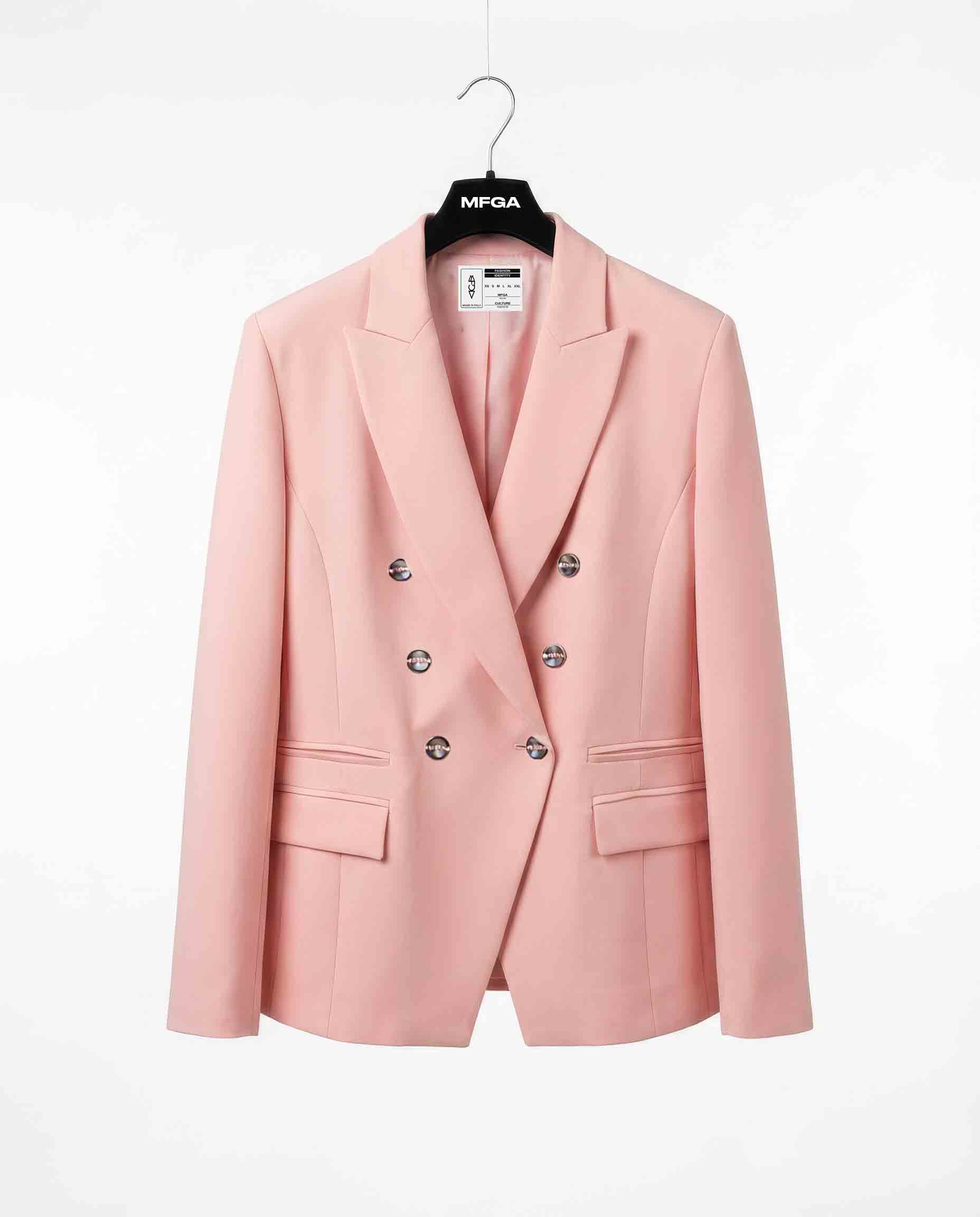 Blazer doppiopetto in tessuto soft touch con rever classico. Chiusura frontale con bottoni MFGA e tasche con patta. Linea strutturata con spalle definite. Tessuto 89% poliestere 11% elastan. Vestibilità regolare.