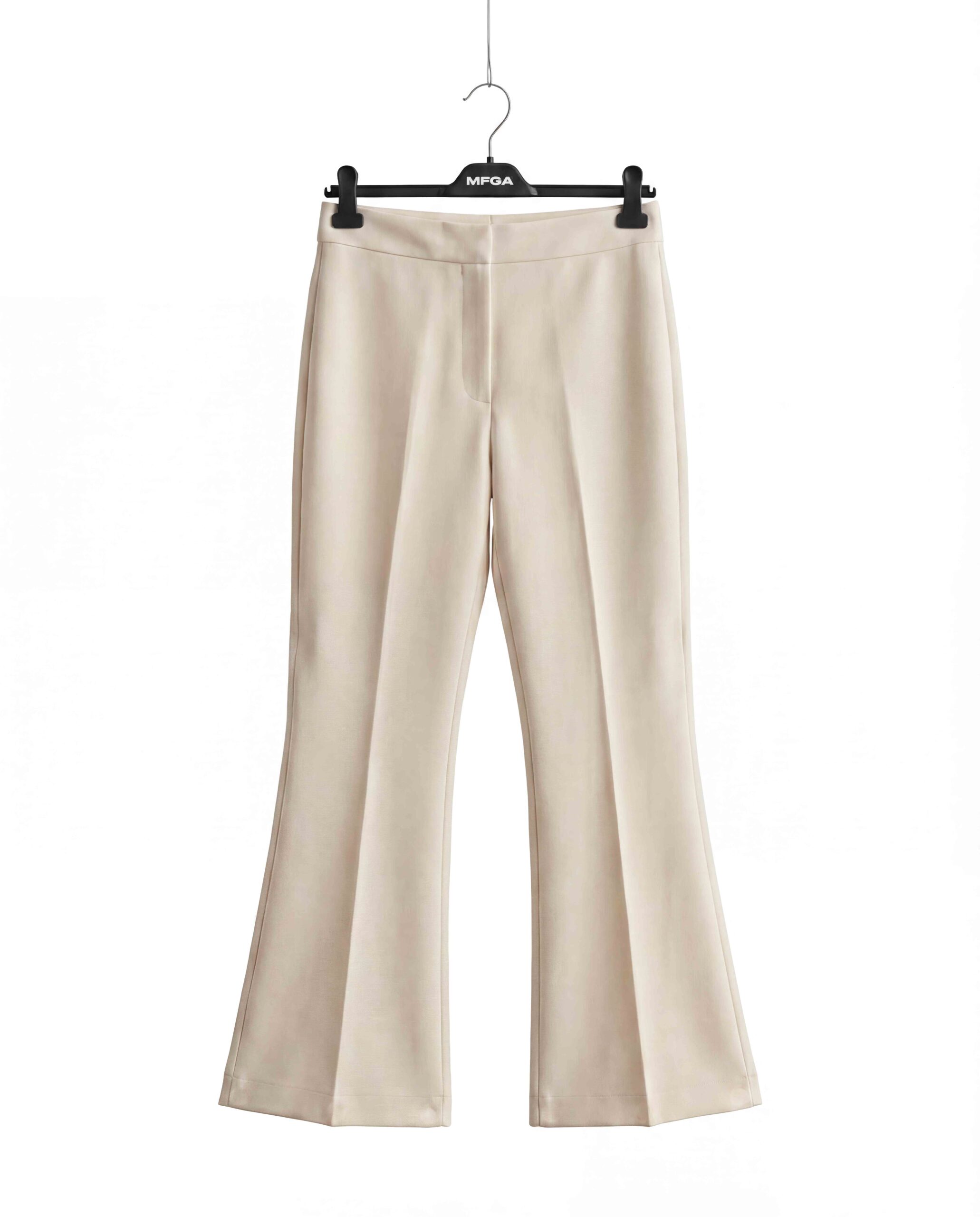 Pantalone flare realizzato in tessuto soft touch elasticizzato, progettato per garantire comfort, struttura e libertà di movimento. La costruzione offre una vestibilità regolare con vita definita e gamba svasata, mantenendo una linea pulita che segue il corpo senza costringerlo.