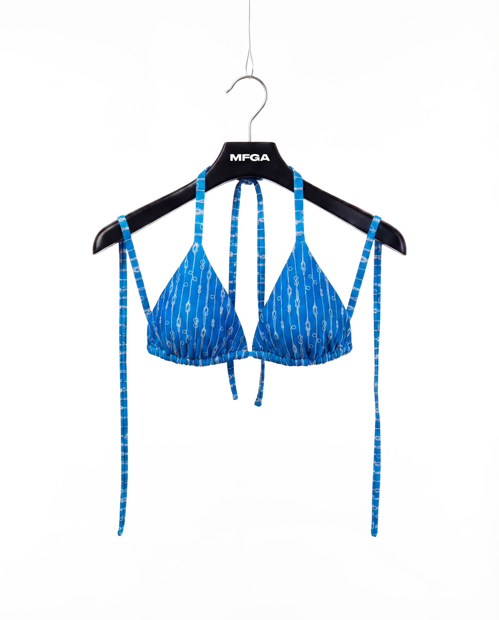 Top bikini a triangolo con laccetti regolabili su collo e schiena. Realizzato in tessuto elasticizzato 90% poliestere 10% elastan con stampa nautica all over. Coppe morbide e costruzione leggera.